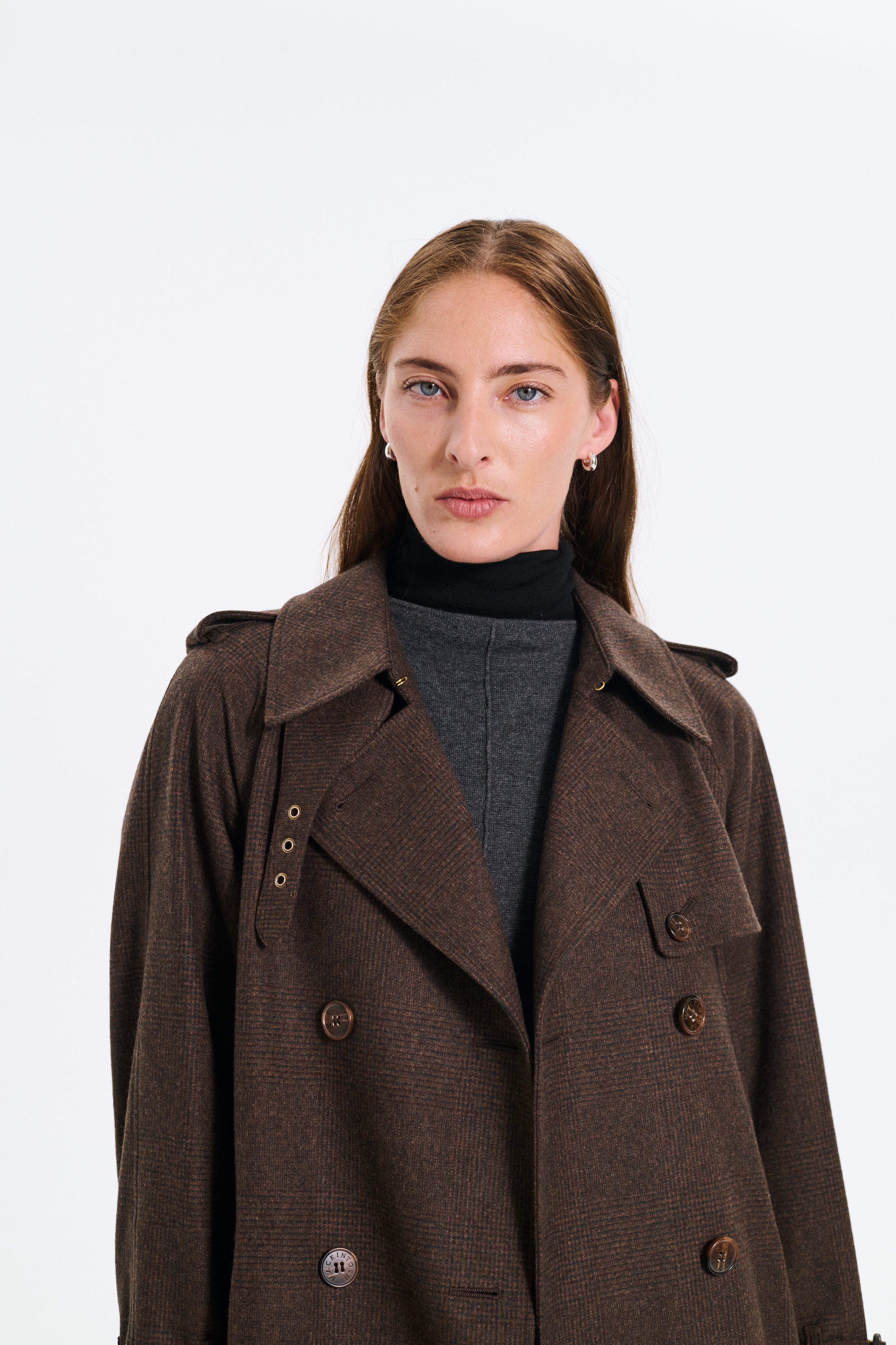 Women's classic trecnh coat with detachable houndstooth wool lining.