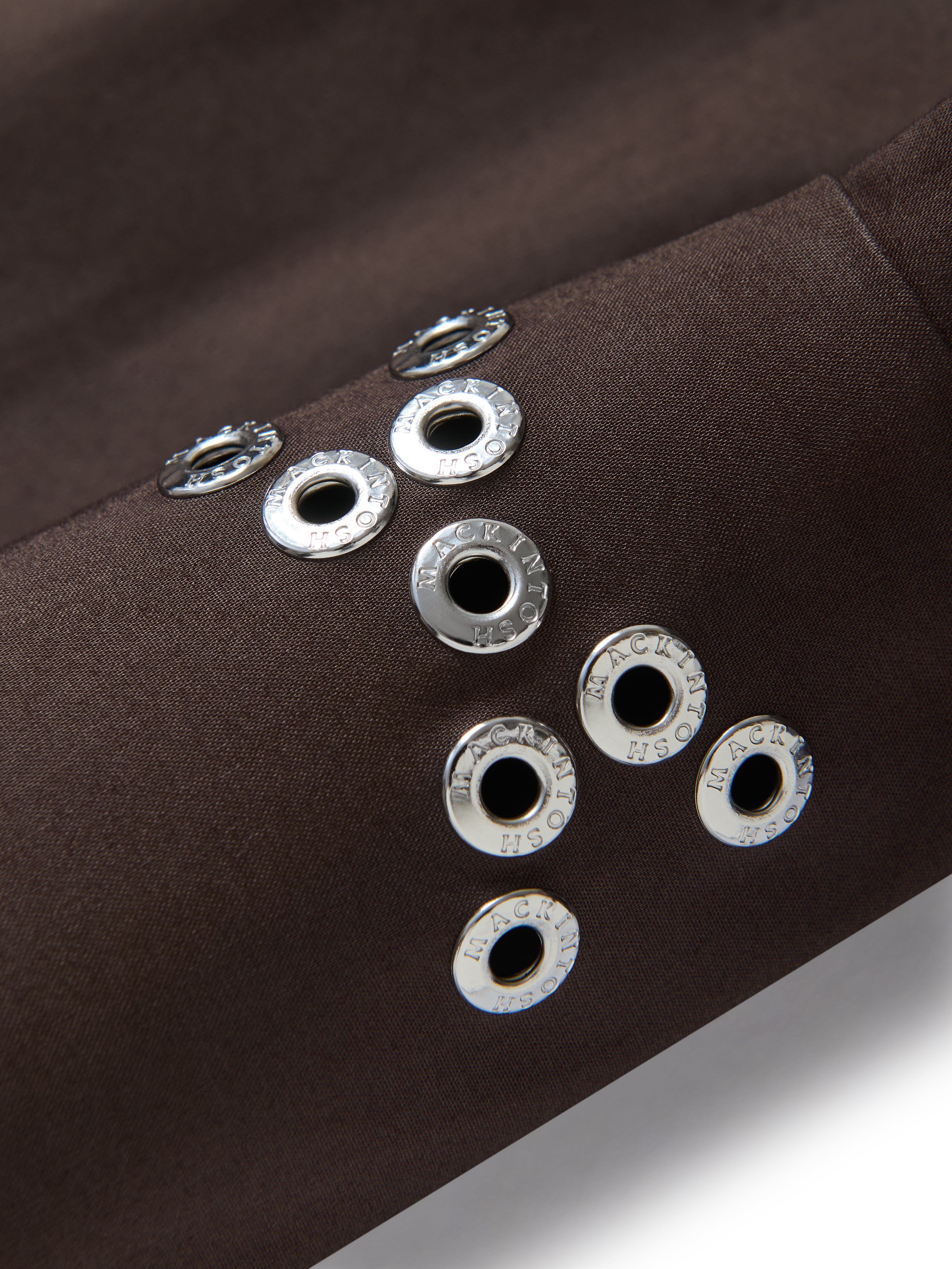 The fluid cut, structured by a shoulder line offset towards the back, is inspired by knitwear to ensure comfort and modernity. The meticulous details, such as the embroidered Scottish cross on the back and the eyelets reworked in the shape of a St Andrews cross, are testament to the technical savoir-faire developed in the Mackintosh ateliers especially for this capsule collection. This unisex coat can be worn with or without its cashmere lining, fastened with exclusive metal buttons adorned with the Scottish cross. The jacket fastens with the same buttons, while two hand-painted porcelain buttons embellish the pockets of the cashmere waistcoat.