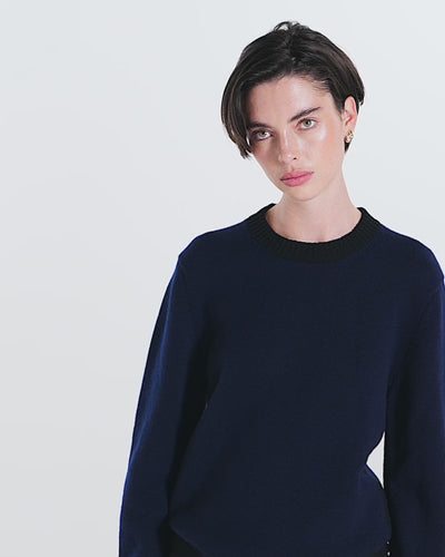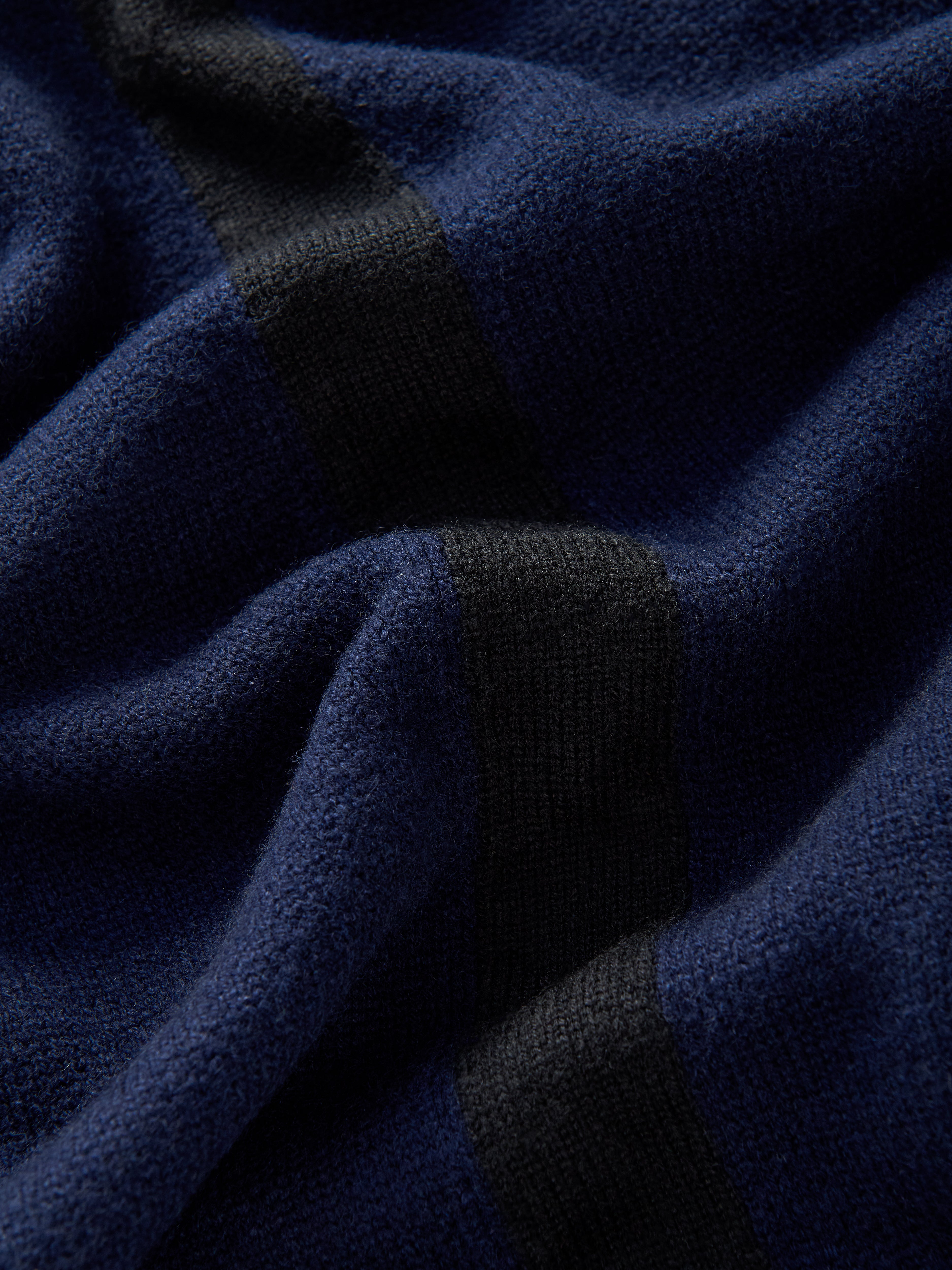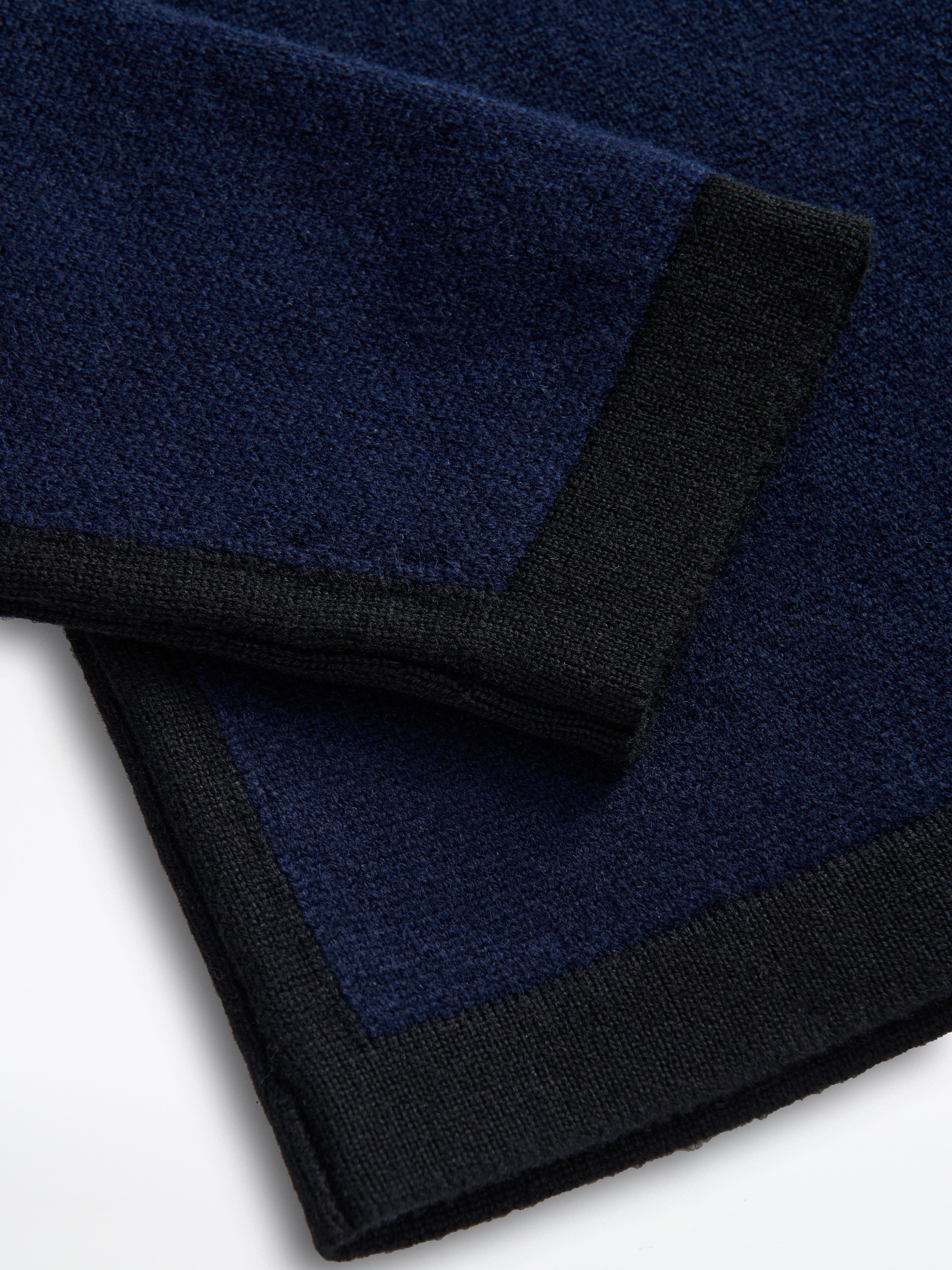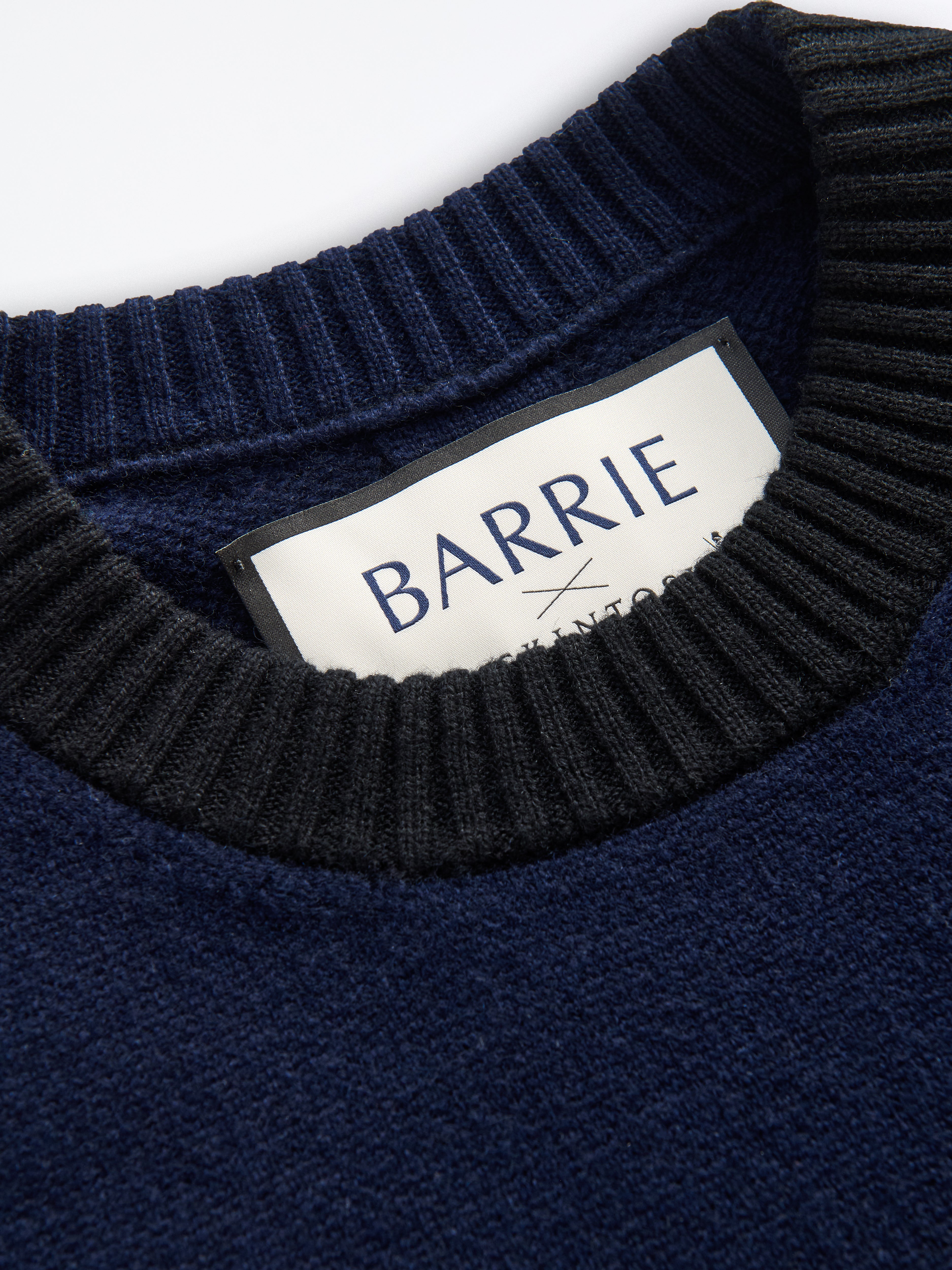 This 100% cashmere jumper combines comfort and technical expertise in a subtle interplay of structure and detail. Knitted with floating stitch on the inside, it gains volume and shape while retaining Barrie's signature enveloping softness. In reference to the iconic finishes of Mackintosh pieces, the famous waterproof strips are reinterpreted here in cashmere in a contrasting colour for a subtle graphic effect. The ribbed collar reinforces the knitwear vibe of this unisex piece.