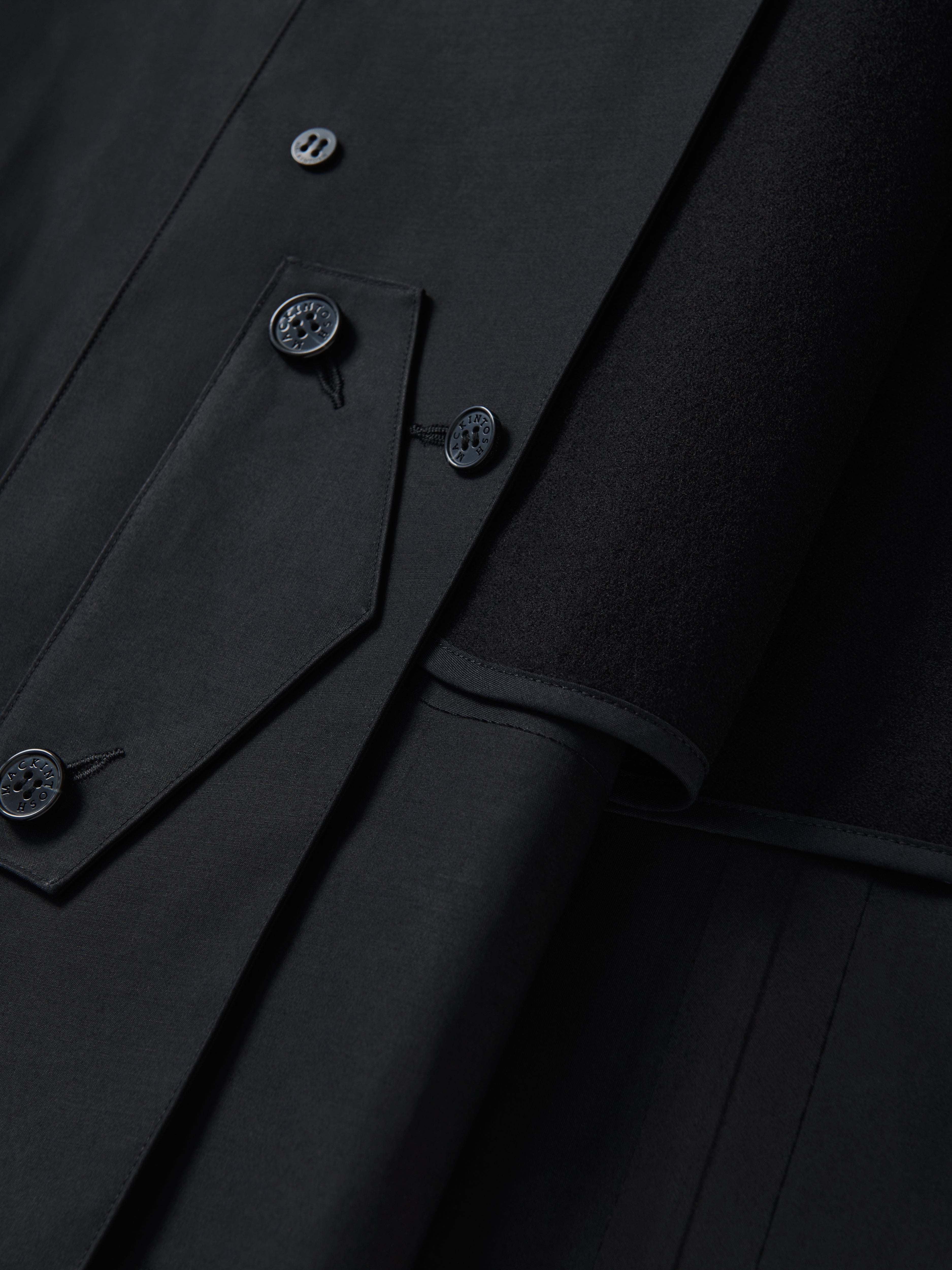 Short balmacaan coat with drop shoulders. The oversized wide silhouette and short length above the knee give it a modern look, while the authentic details such as the rivet-reinforced flap pockets and detachable chin tab make this piece stand out.