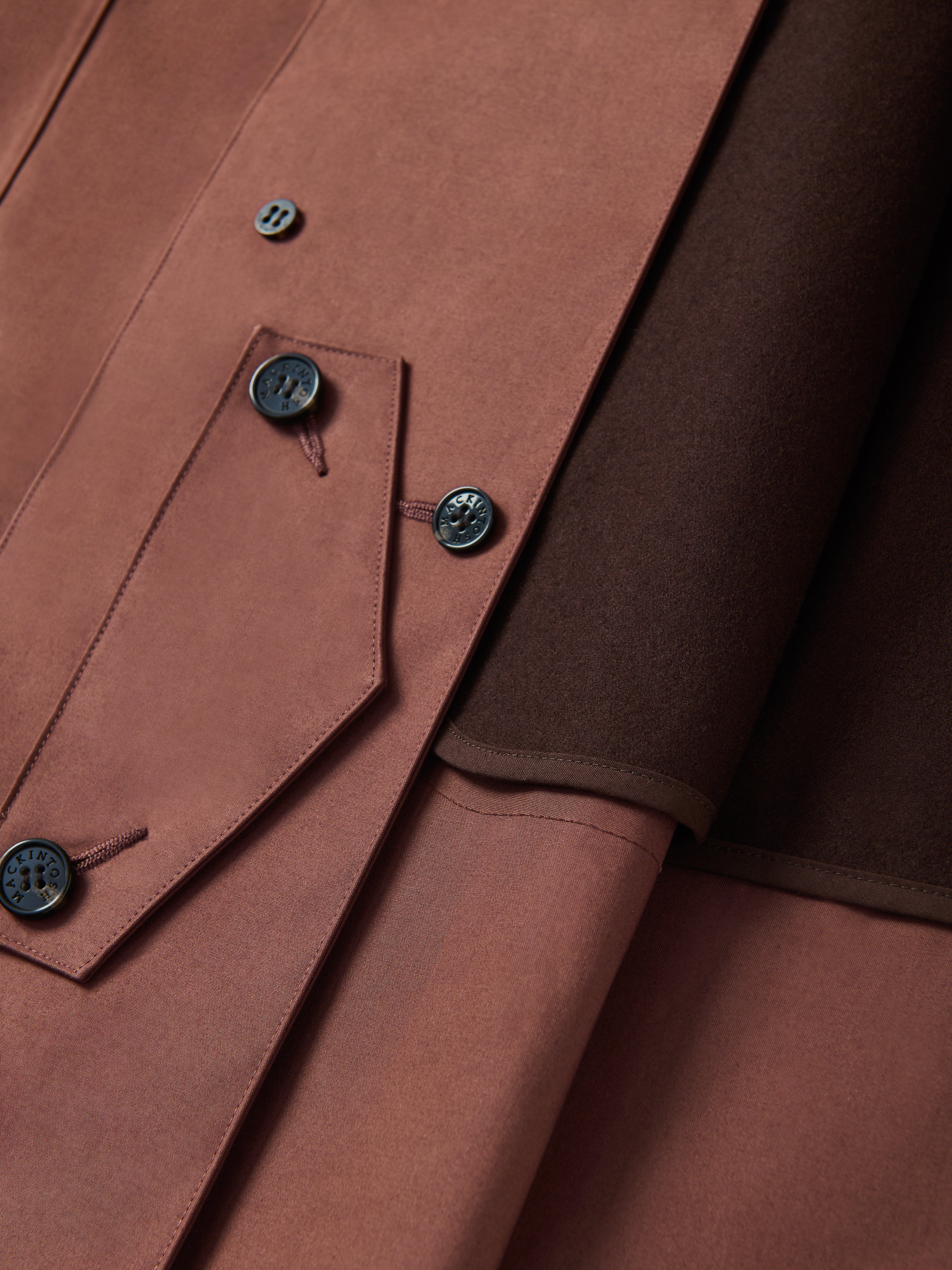 Short balmacaan coat with drop shoulders. The oversized wide silhouette and short length above the knee give it a modern look, while the authentic details such as the rivet-reinforced flap pockets and detachable chin tab make this piece stand out.