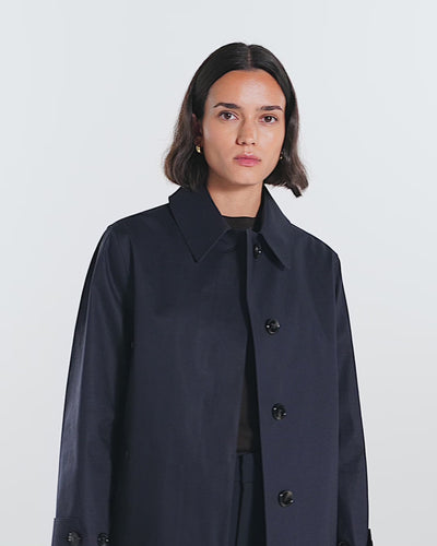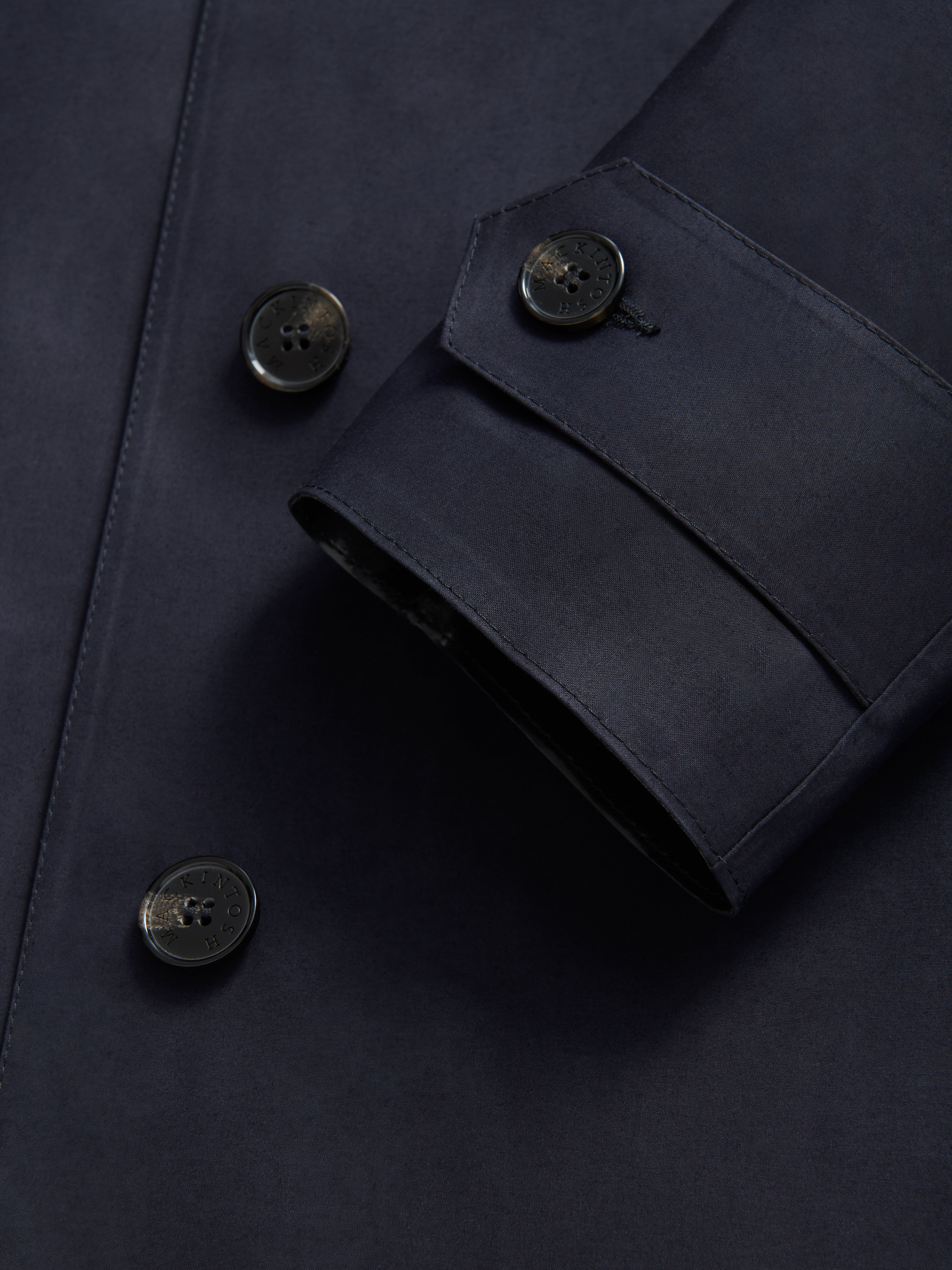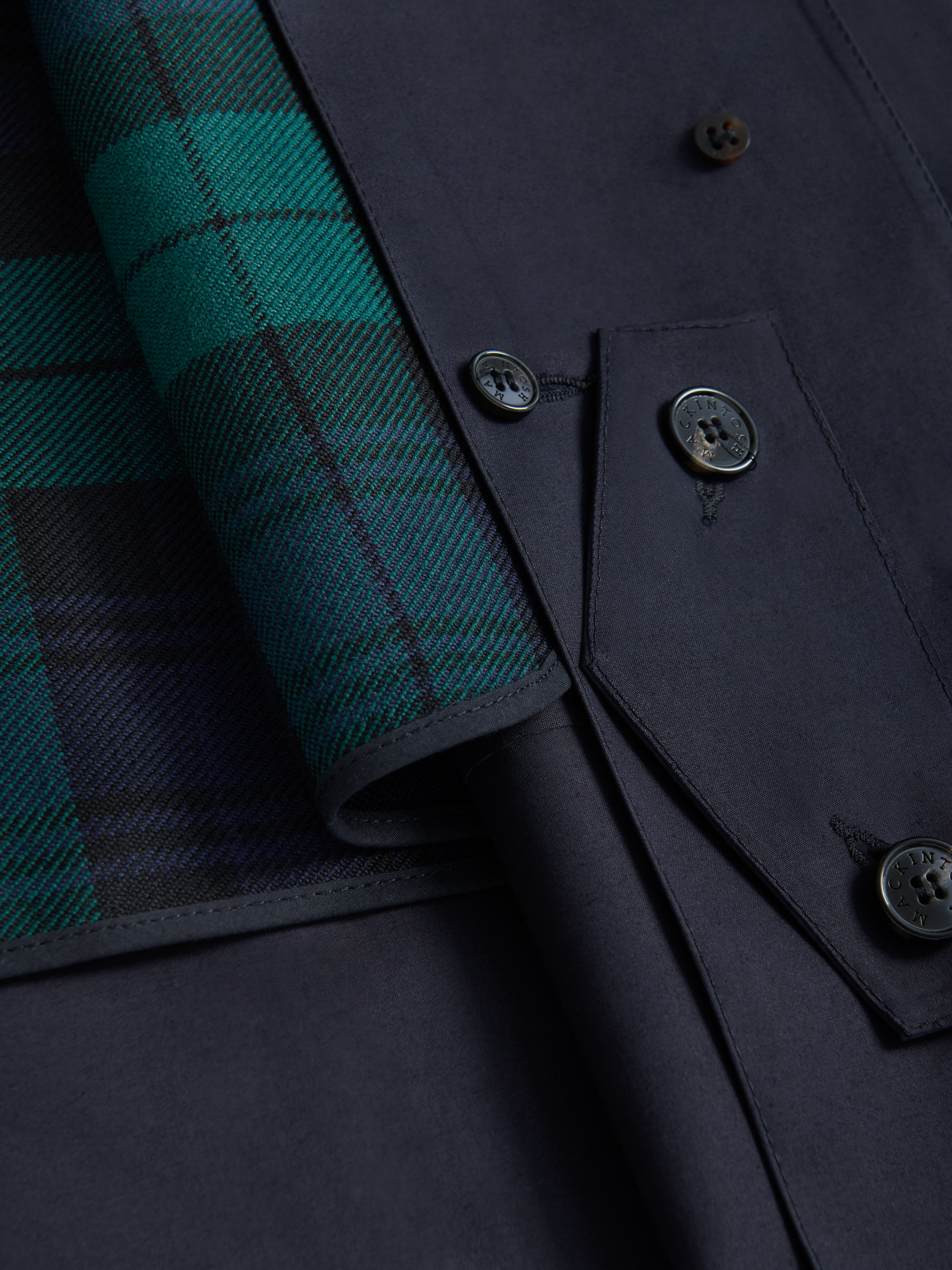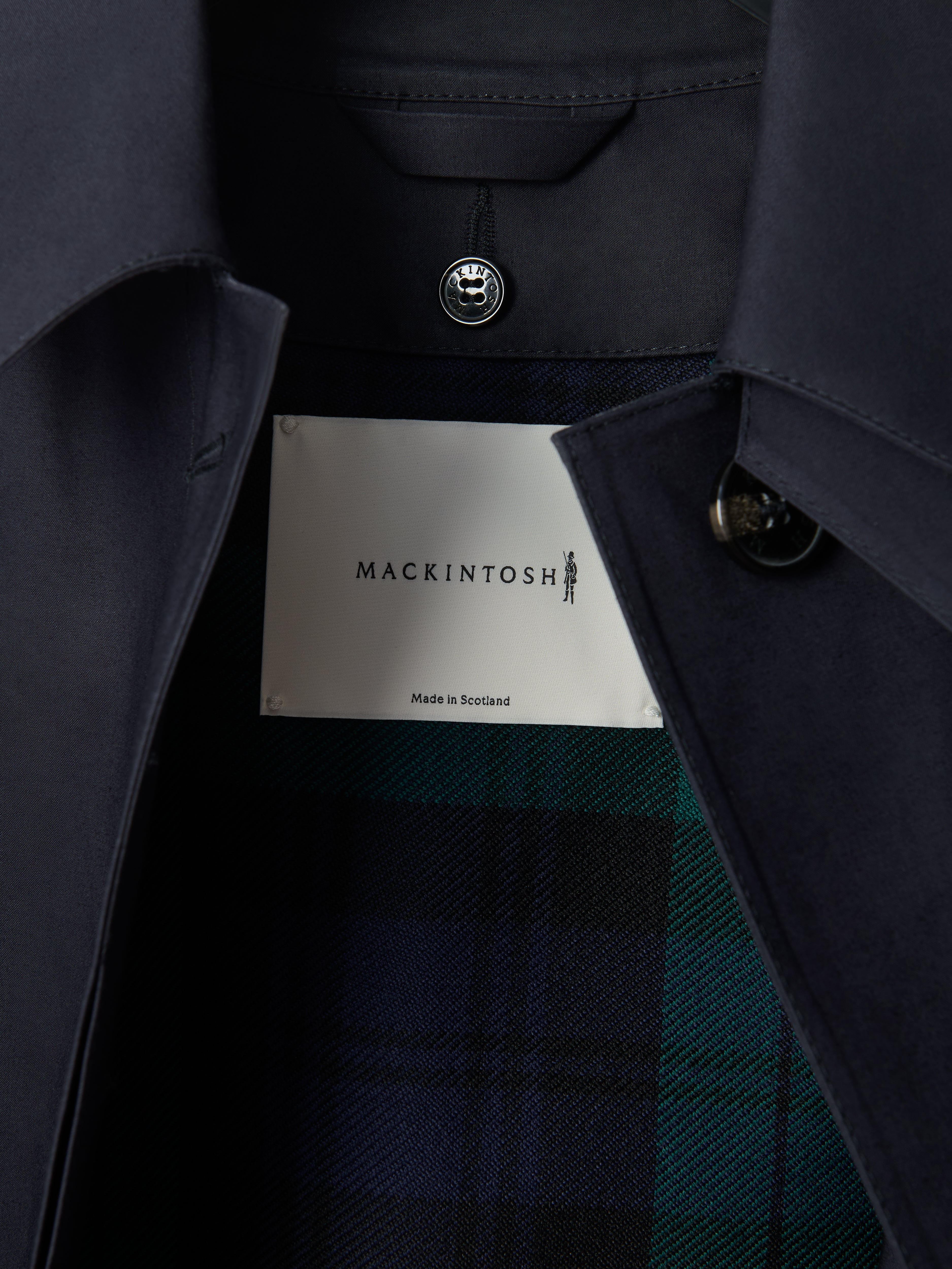 Mackintosh signature model. This piece has a timeless, minimalist design that is not influenced by trends, and a beautiful A-line silhouette. Comes with a detachable tartan check wool liner for all-season wear.