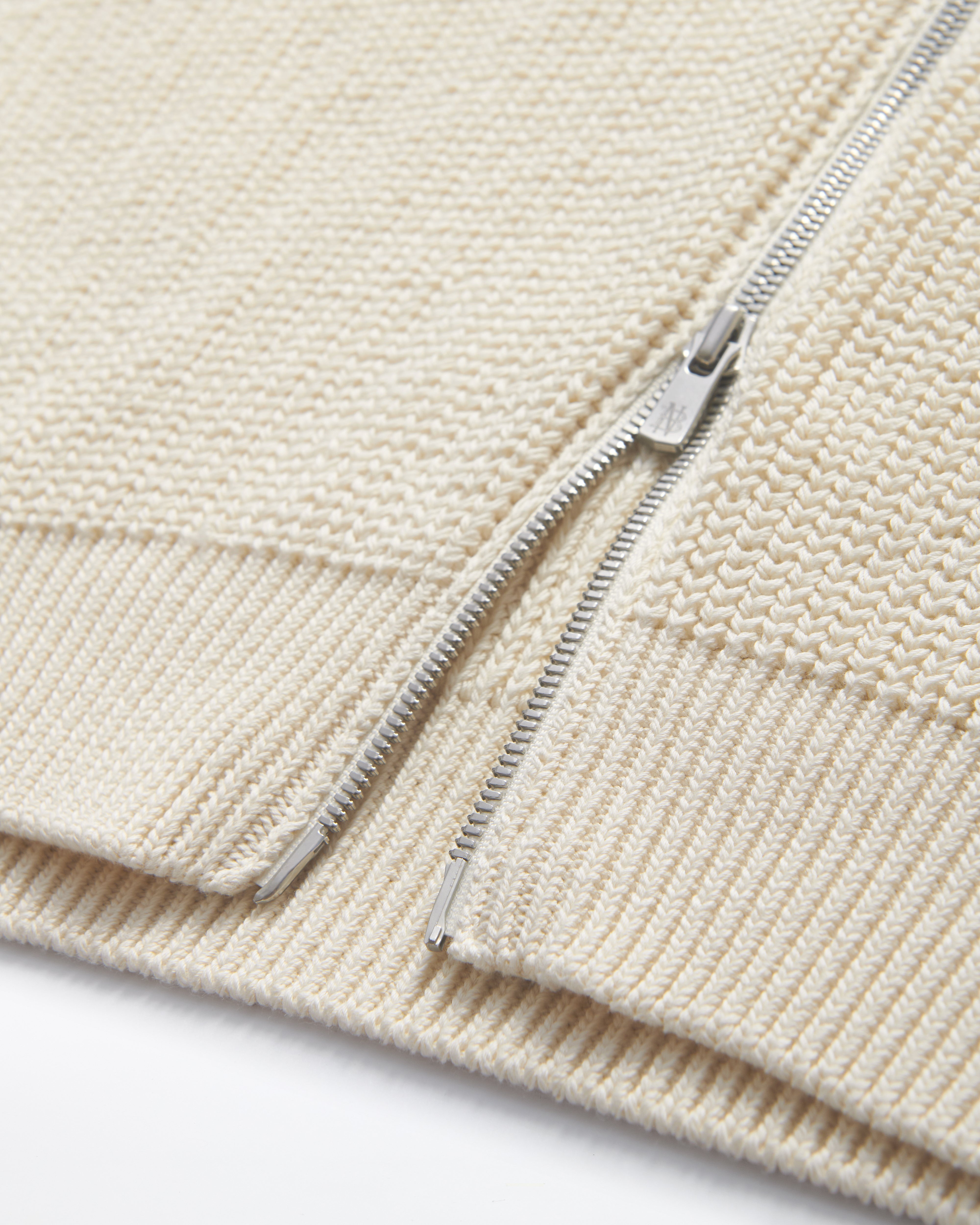 This 100% cotton zip-through vest features a two way zipper and the yarn is spun using hand-picked Ginza cotton giving it a moderately soft and smooth handle.