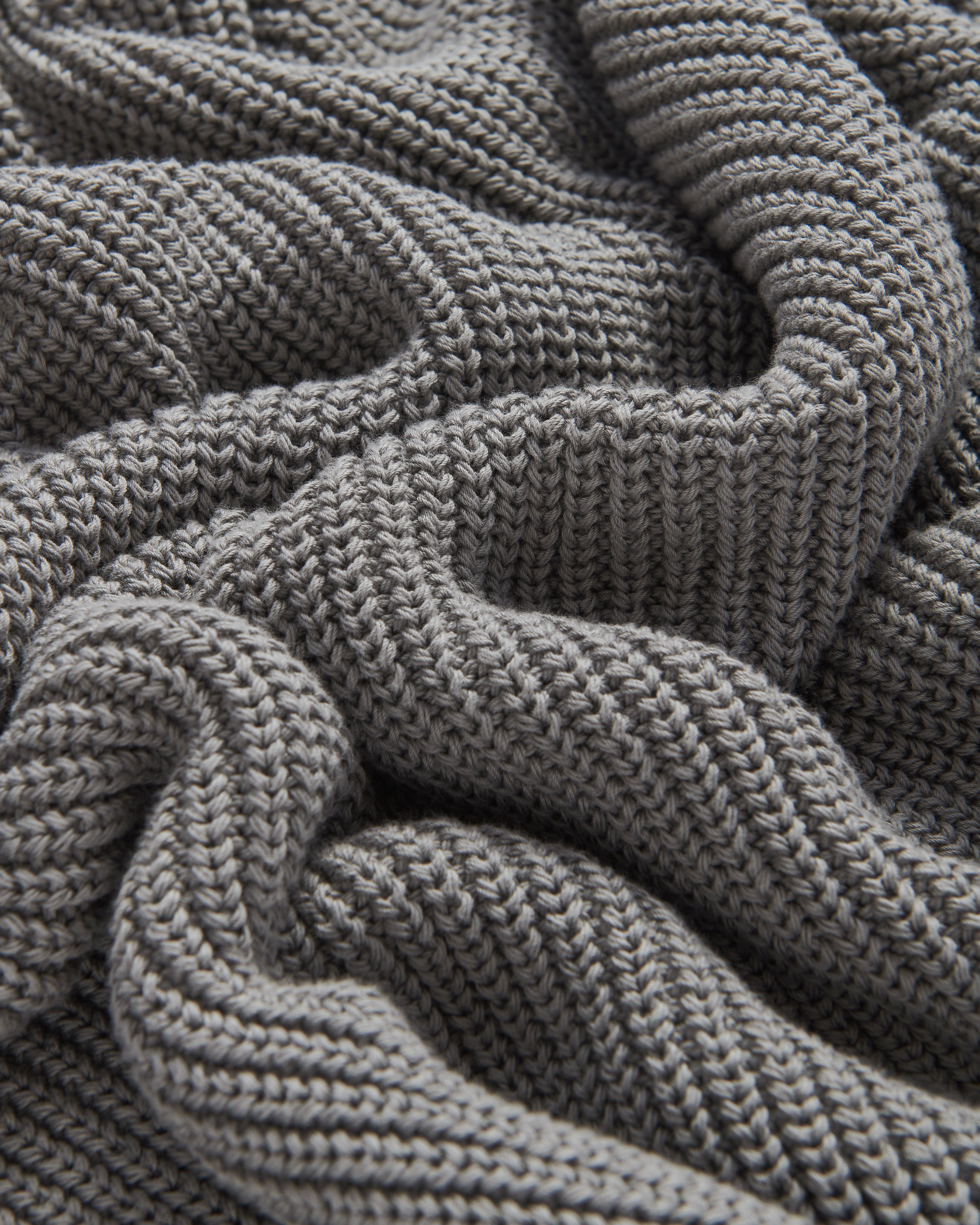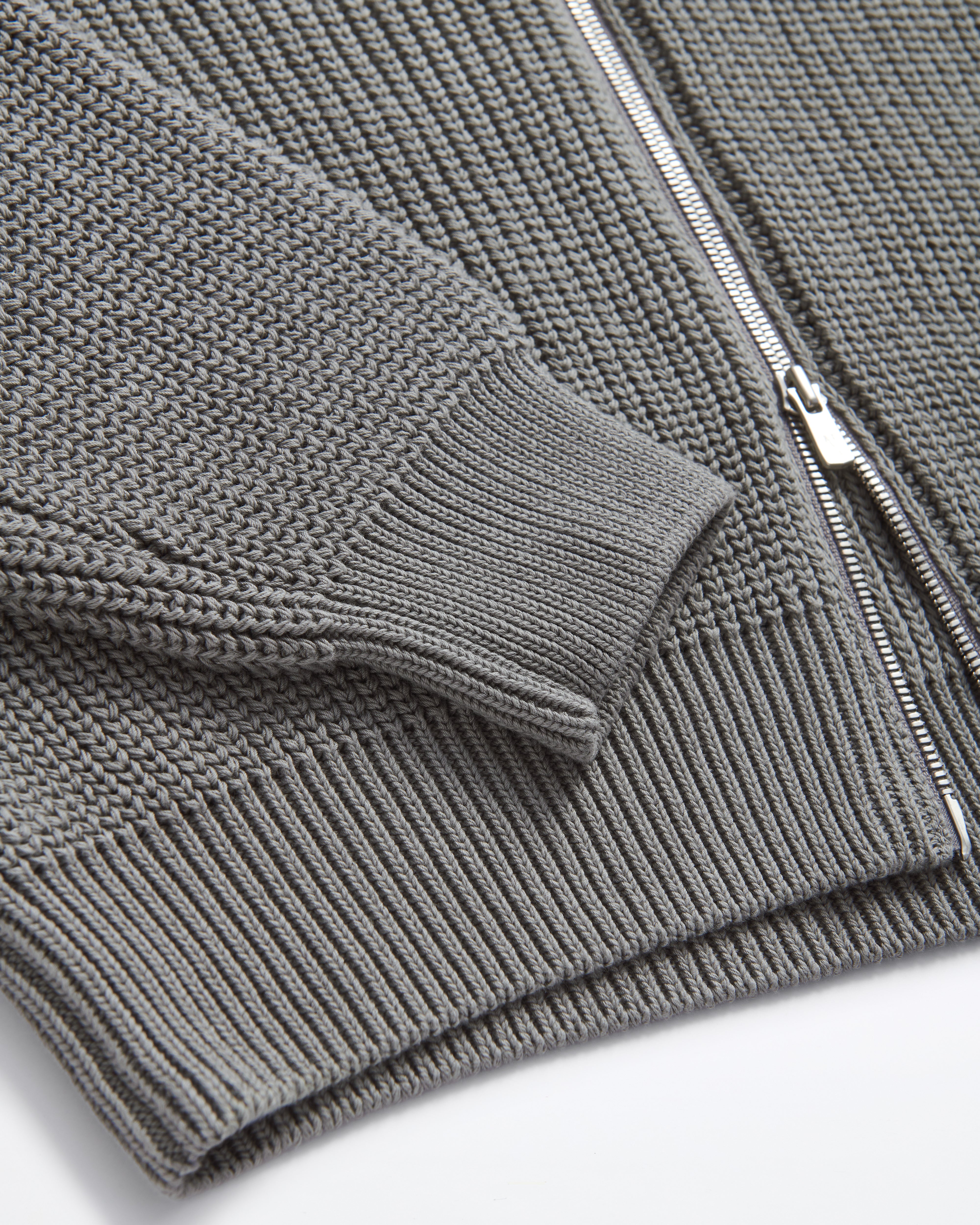 BATONER x Mackintosh. A full zip knitted cardigan in grey using 100% hand-picked Giza cotton.