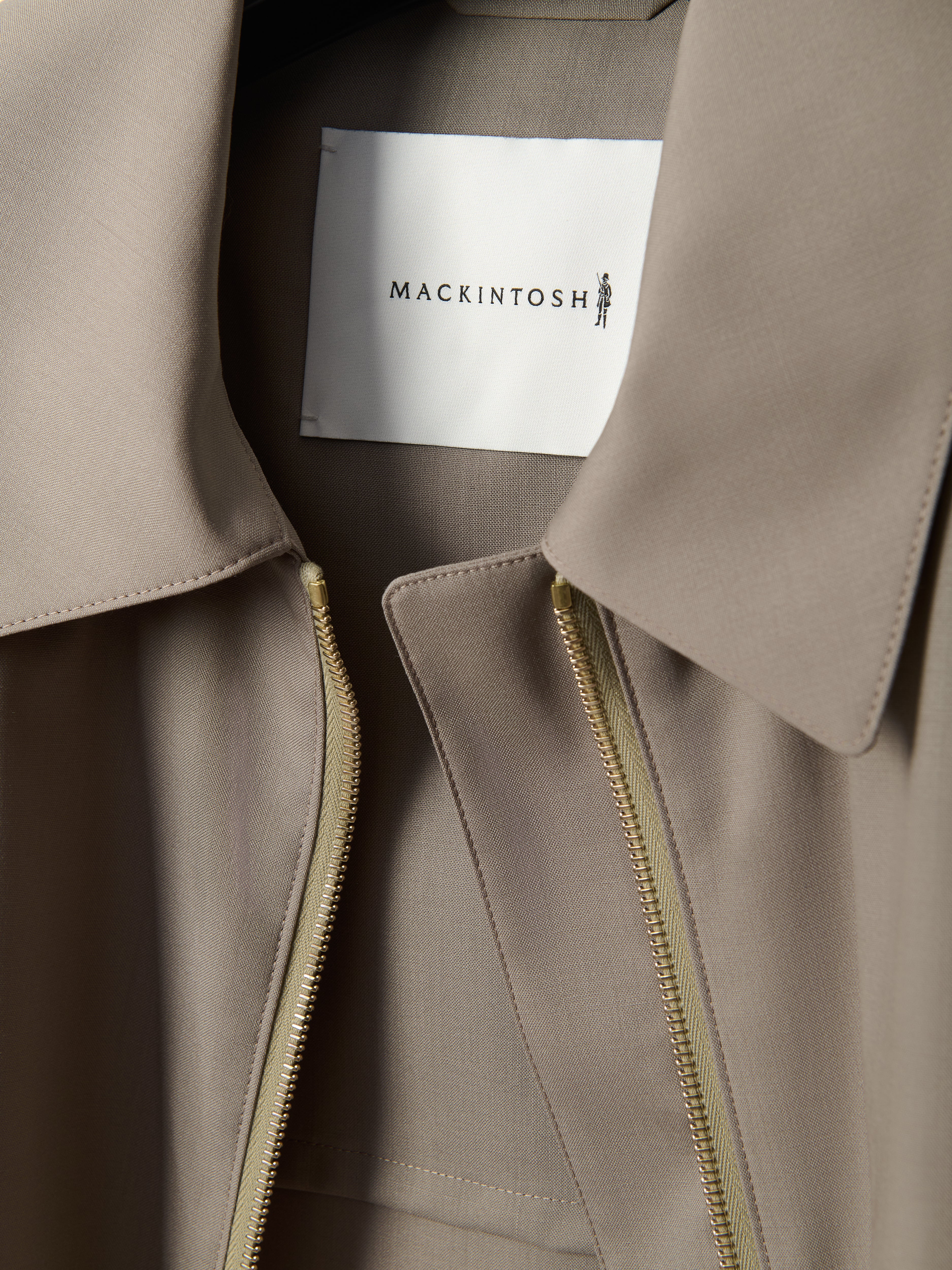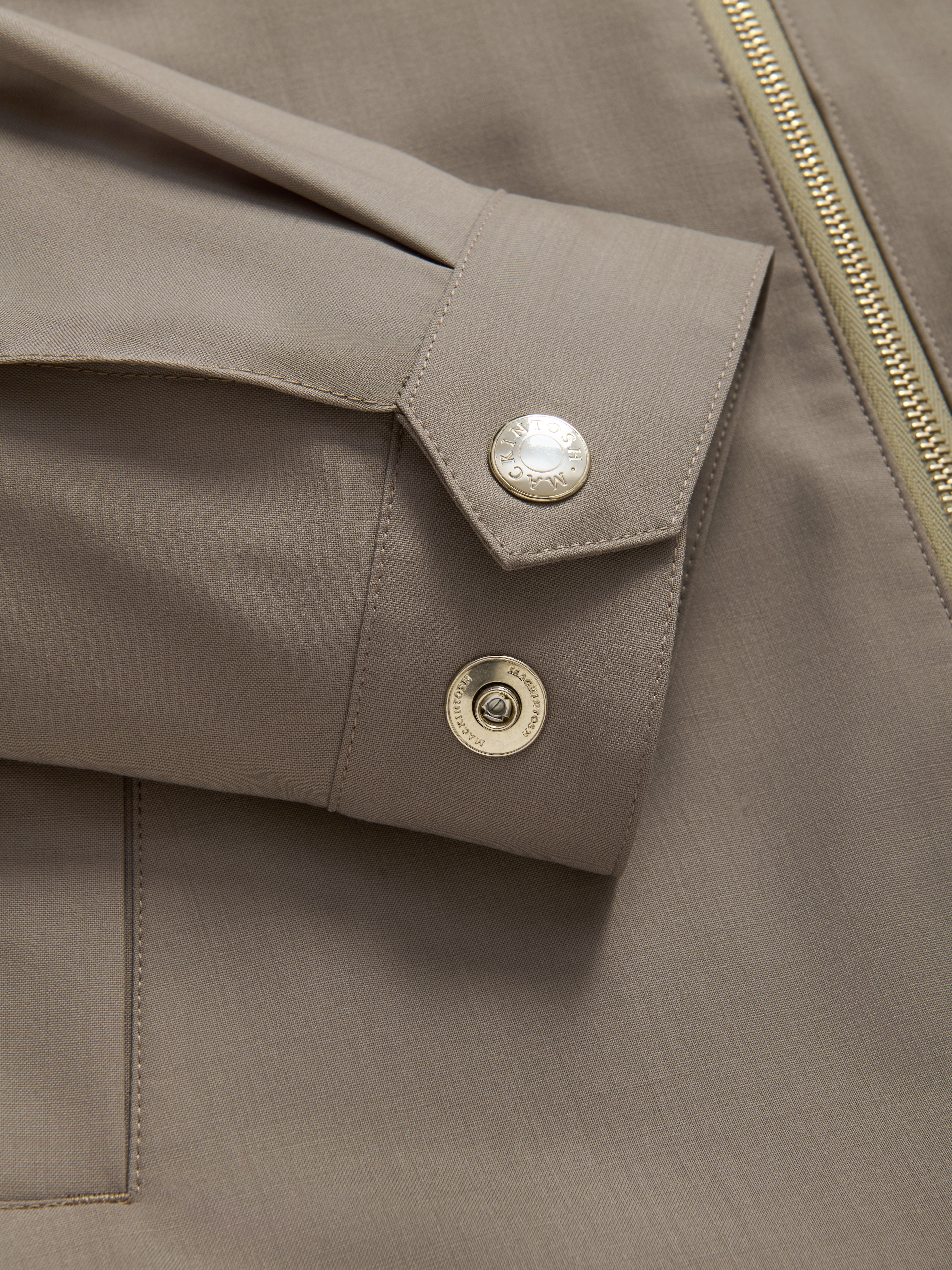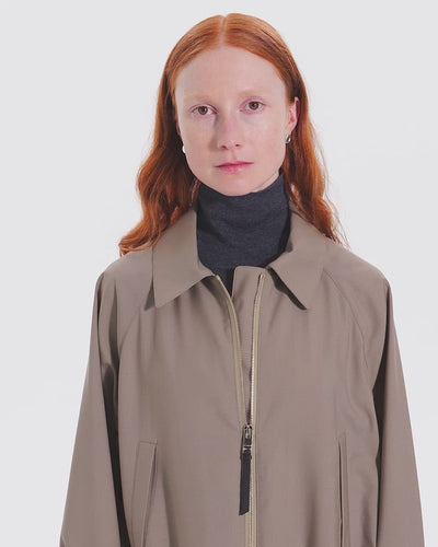 An elegant raglan zip-up wool blouson, balancing its cropped length with the voluminous body.
