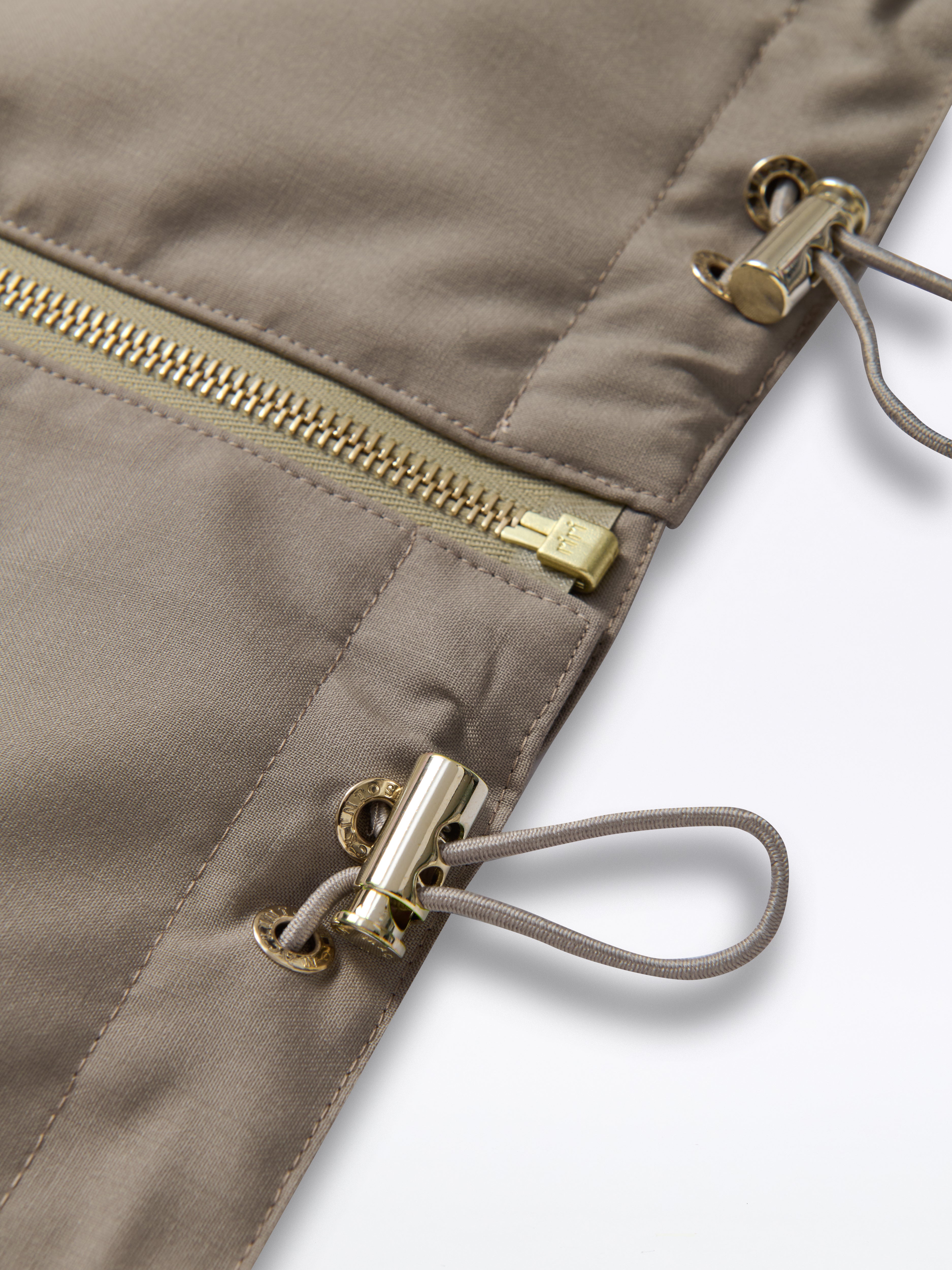 This is an elegant raglan zip-up blouson that exudes a fashionable vibe, balancing its cropped length with the voluminous body. You can enjoy various styling options by blousing it around the waist. It stands out for its beautiful silhouette and versatile coordination possibilities, with the leather zipper pull serving as an additional accent.