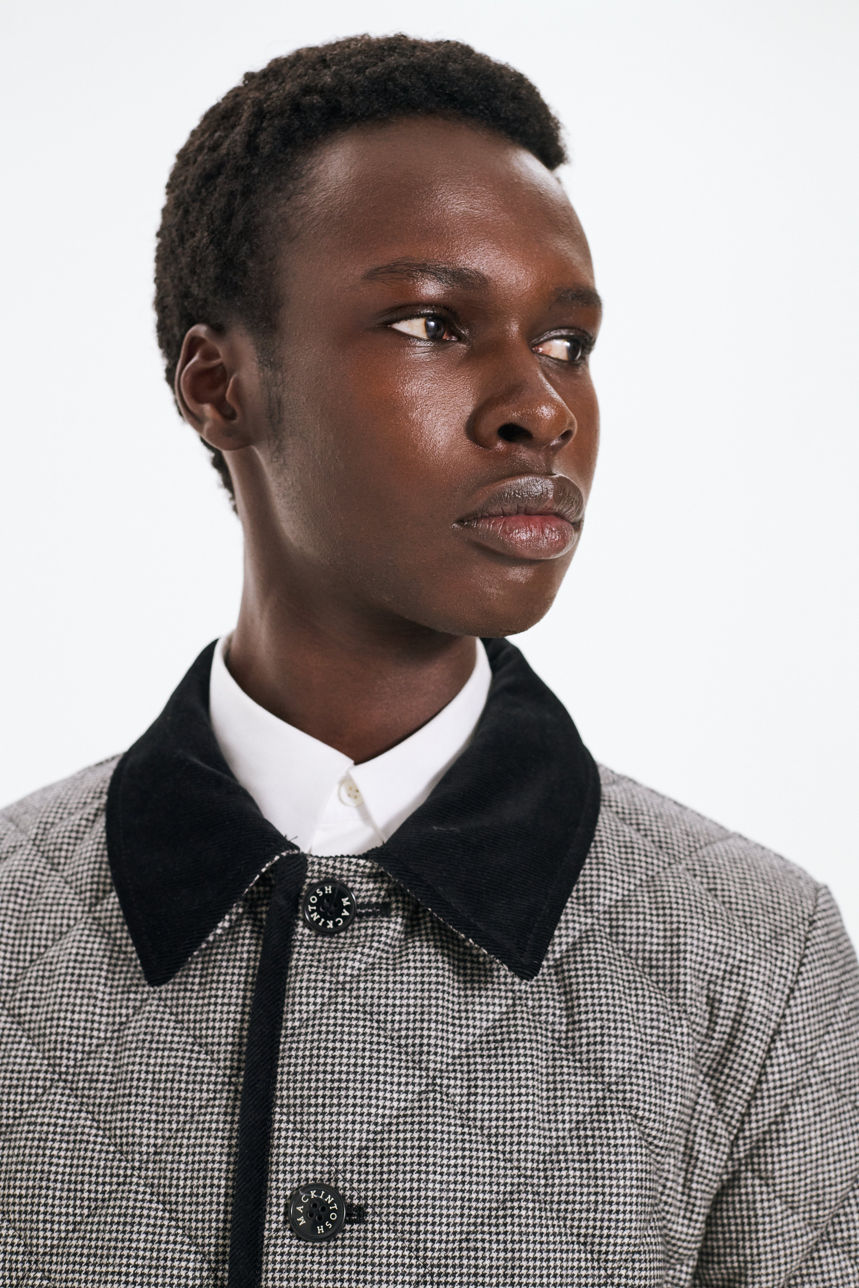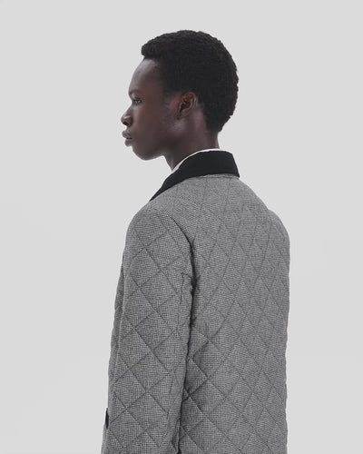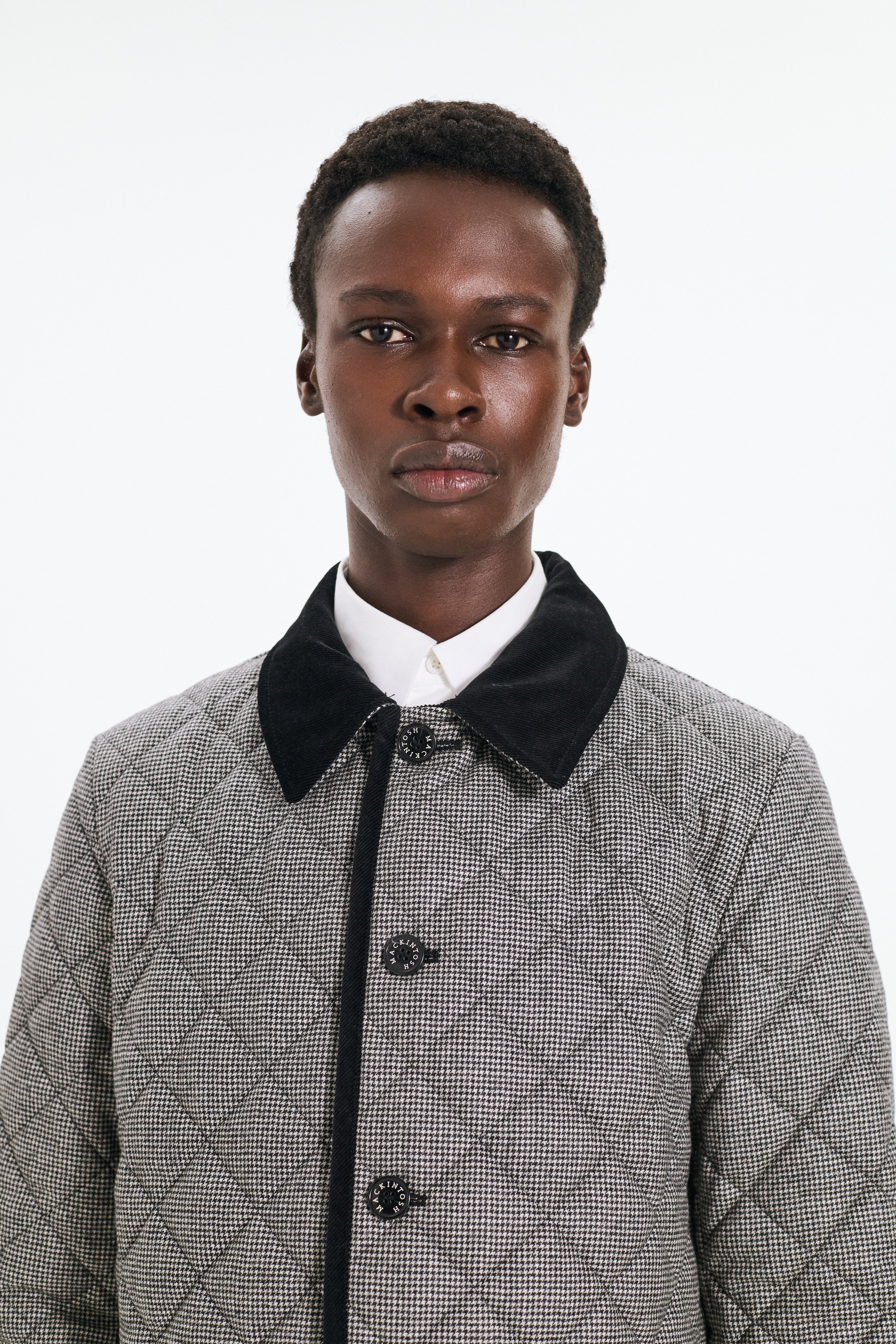 A versatile quilted jacket in a black & white Glencheck with patch pockets, corduroy collar, pocket & placket detailing.