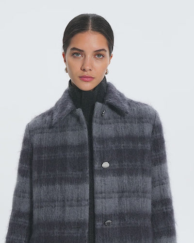 Mackintosh's signature model, the Banton, features a beautifully gentle A-line silhouette, offering a timeless design. This piece is crafted from shaggy tweed, exuding a British ambiance.