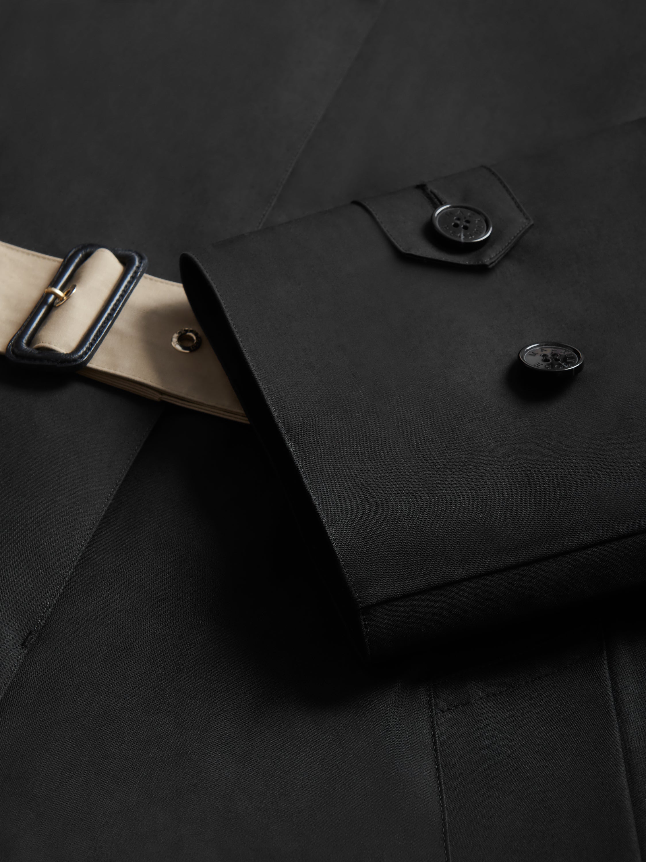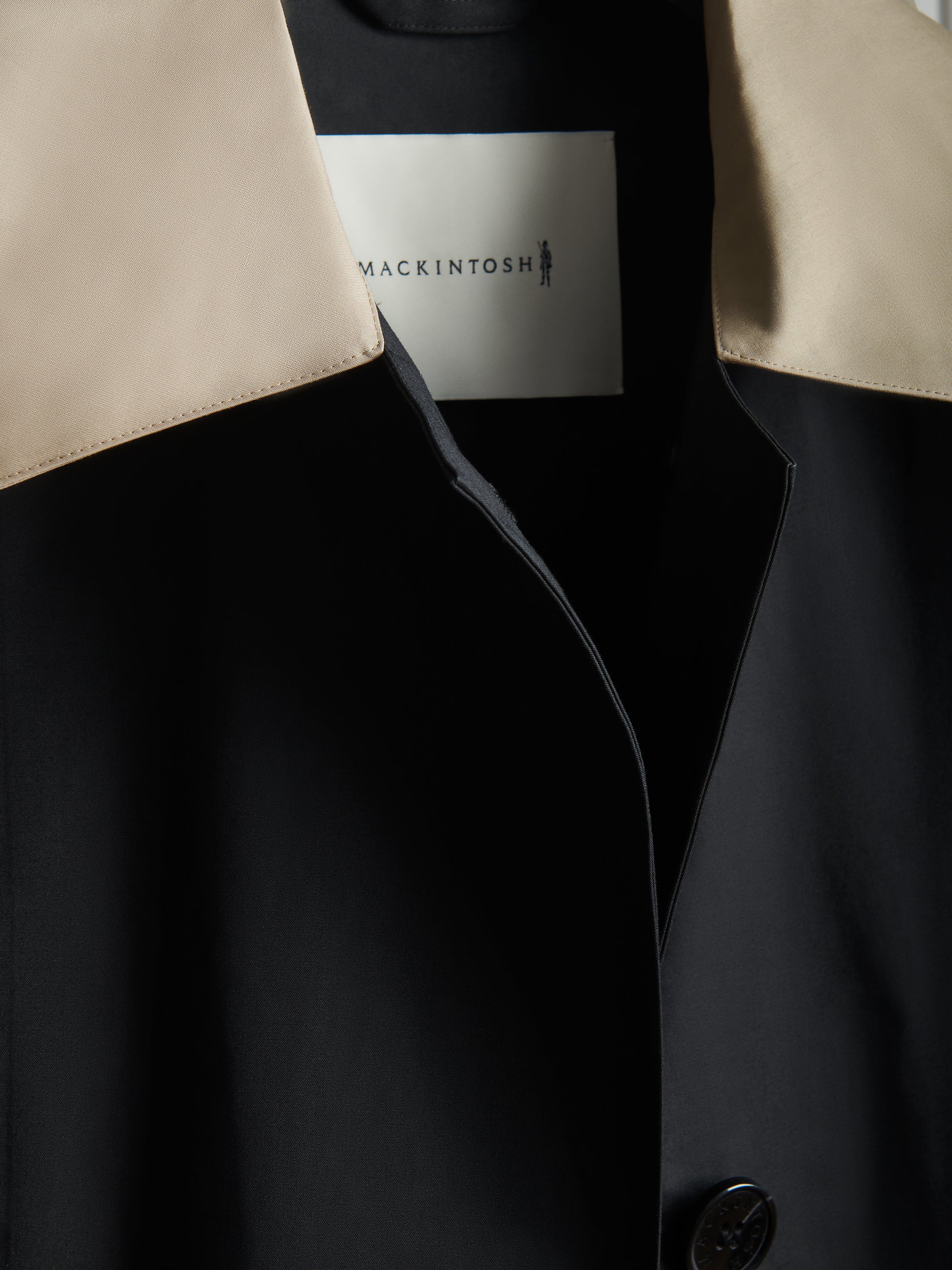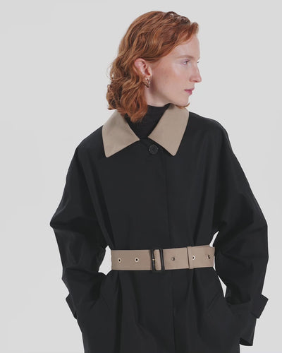 Oversized belted balmacaan coat. This piece has an authentic design, a voluminous A-line silhouette, and a maxi length that gives it a modern feel. The colour block design on the collar, waist belt, and inside gives it a contemporary look.
