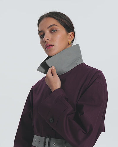 Oversized belted balmacaan coat. This piece has an authentic design, a voluminous A-line silhouette, and a maxi length that gives it a modern feel. The colour block design on the collar, waist belt, and inside gives it a contemporary look.