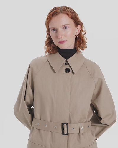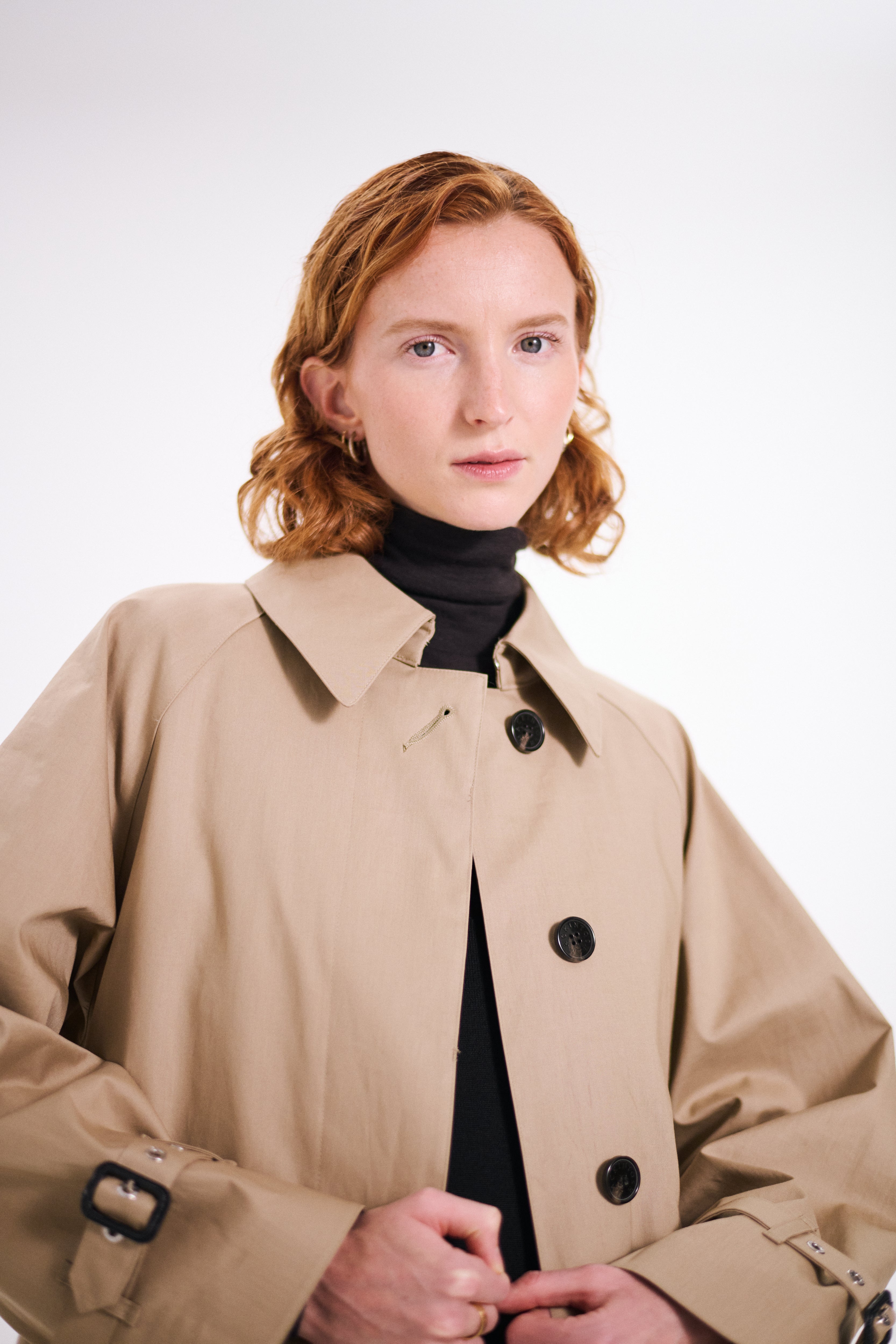 Single trench coat with one piece raglan sleeve.  A relaxed and elegant silhouette with impressive square pockets. When the belt is tightened, the wide umbrella yoke bounces off the horizontal silhouette, creating a dramatic mood. Comes with a detachable liner made of soft tweed with an English houndstooth pattern, making it suitable for all seasons.