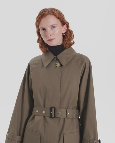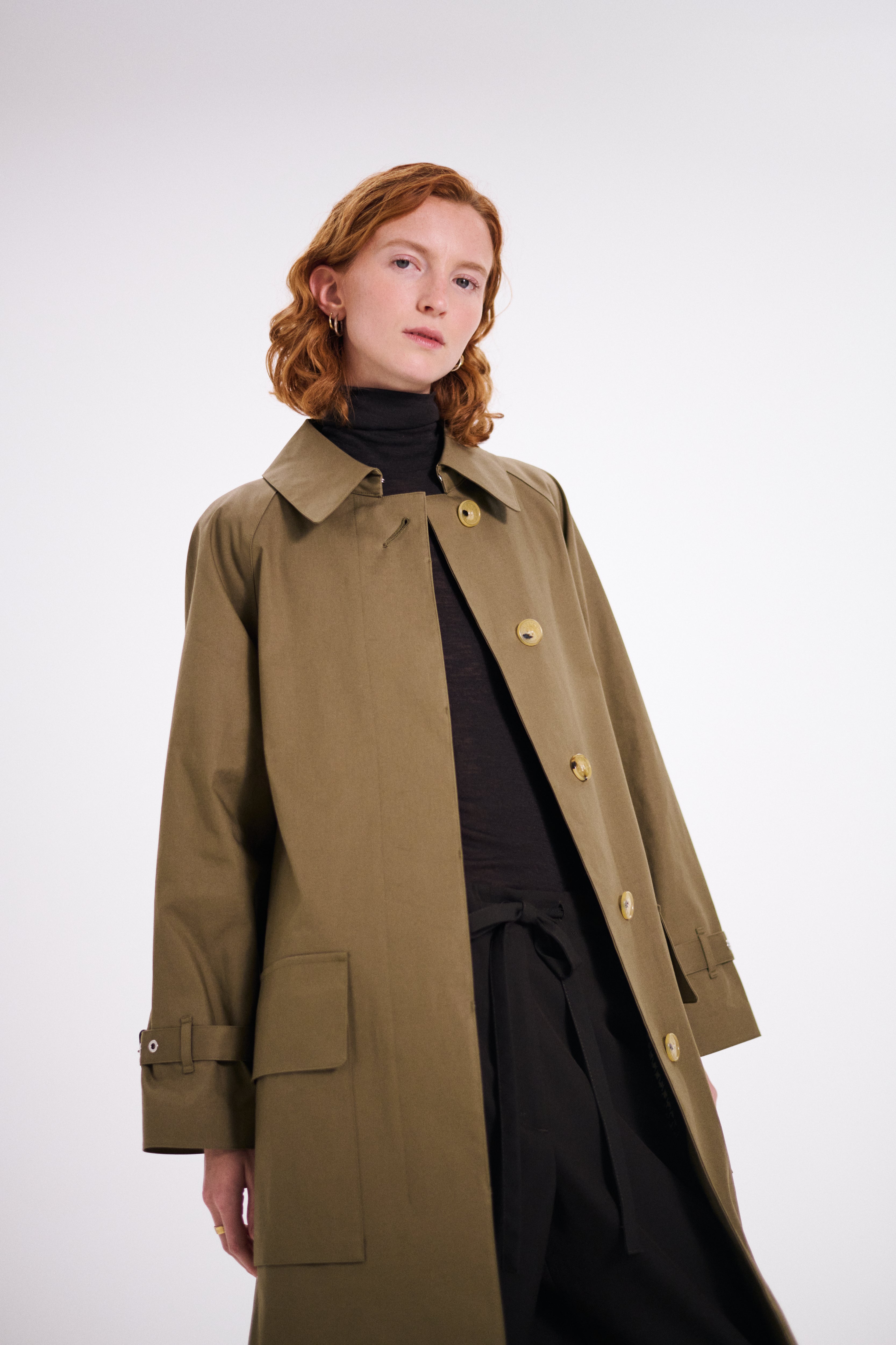 Single trench coat with one piece raglan sleeve.  A relaxed and elegant silhouette with impressive square pockets. When the belt is tightened, the wide umbrella yoke bounces off the horizontal silhouette, creating a dramatic mood. Comes with a detachable liner made of soft tweed with an English houndstooth pattern, making it suitable for all seasons.