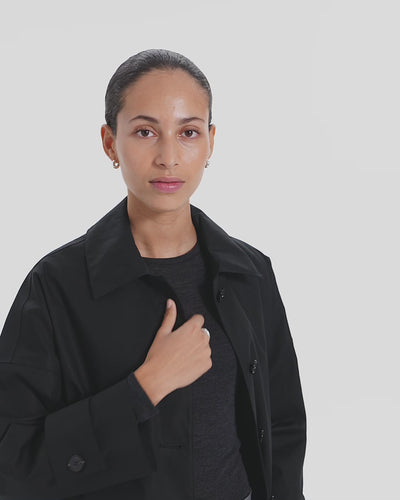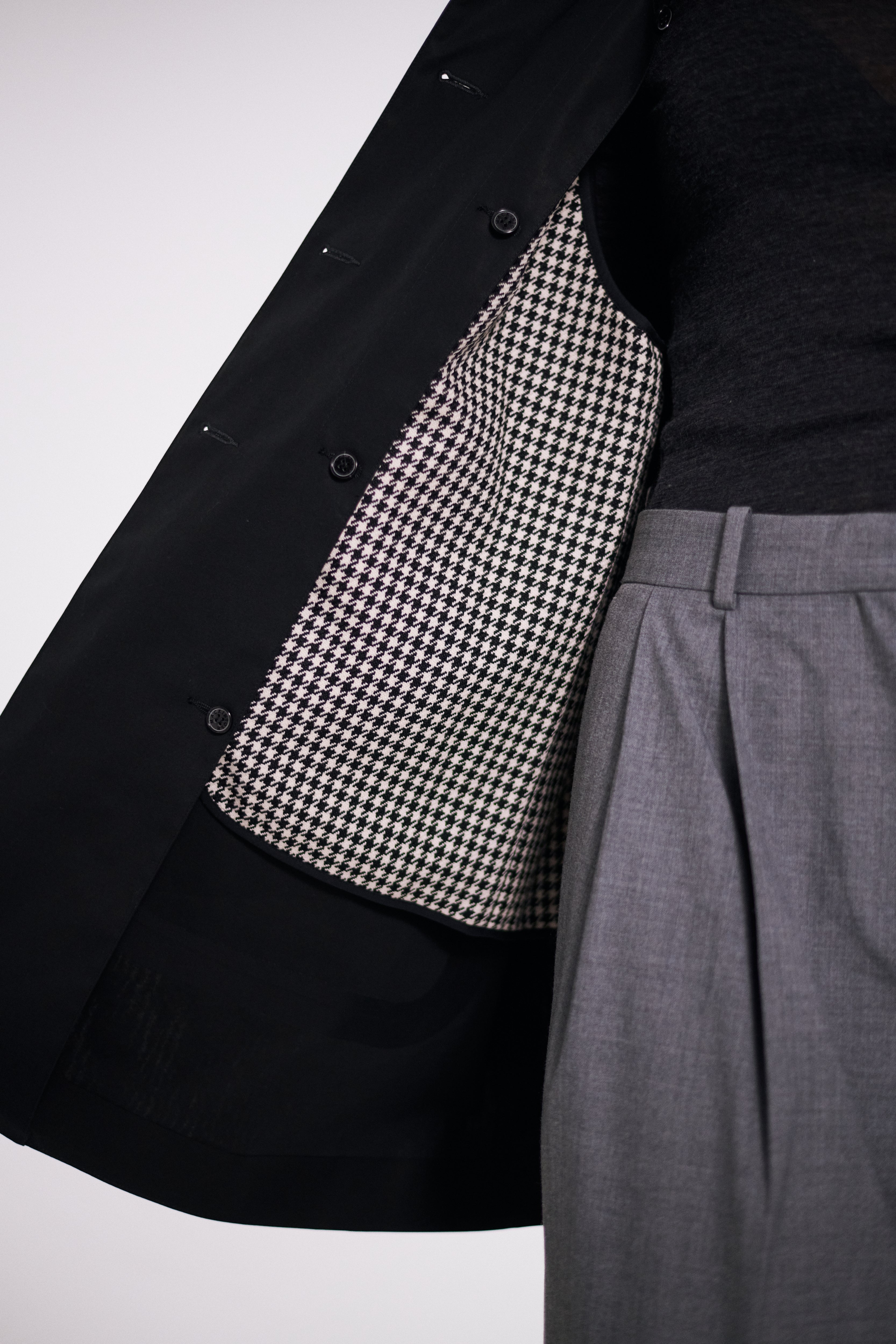 Short balmacaan coat with drop shoulders. An impressive piece with an oversized A line wide silhouette. The modern design stands out with authentic details such as rivet-reinforced flap pockets and a detachable neck latch. Comes with a detachable liner made of soft tweed with an English houndstooth pattern,  making it suitable for all seasons.