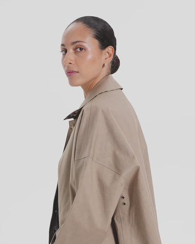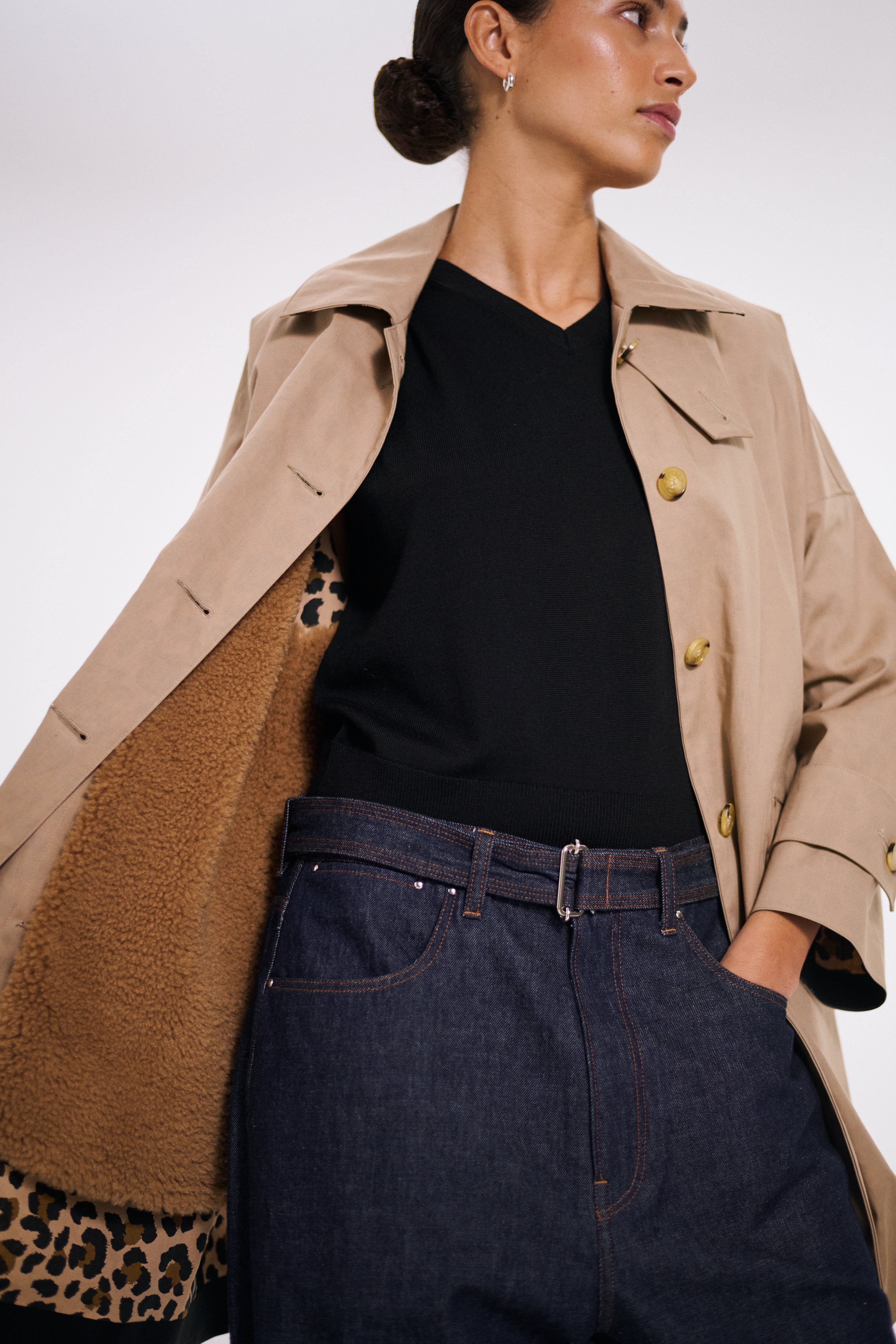 Short balmacaan coat with drop shoulders. An impressive piece with an oversized A line wide silhouette. The modern design stands out with authentic details such as rivet-reinforced flap pockets and a detachable chin tab. A leopard print is used on the back side, and comes with a detachable liner made of ECO fur, making it suitable for all seasons.