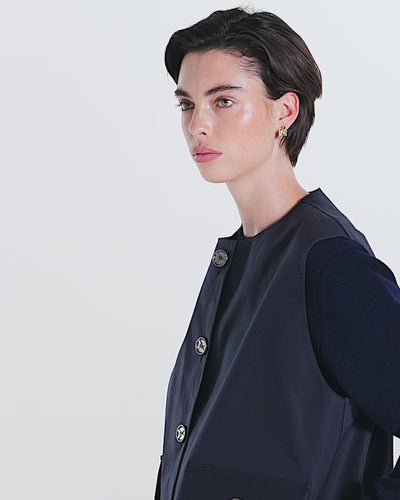This sleeveless jacket, made from waterproof coated cotton, perfectly embodies the Barrie and Mackintosh partnership, combining utilitarian design with refined elegance. This exceptional piece seamlessly complements the Barrie x Mackintosh collection, lending itself to layering with all the other pieces.
