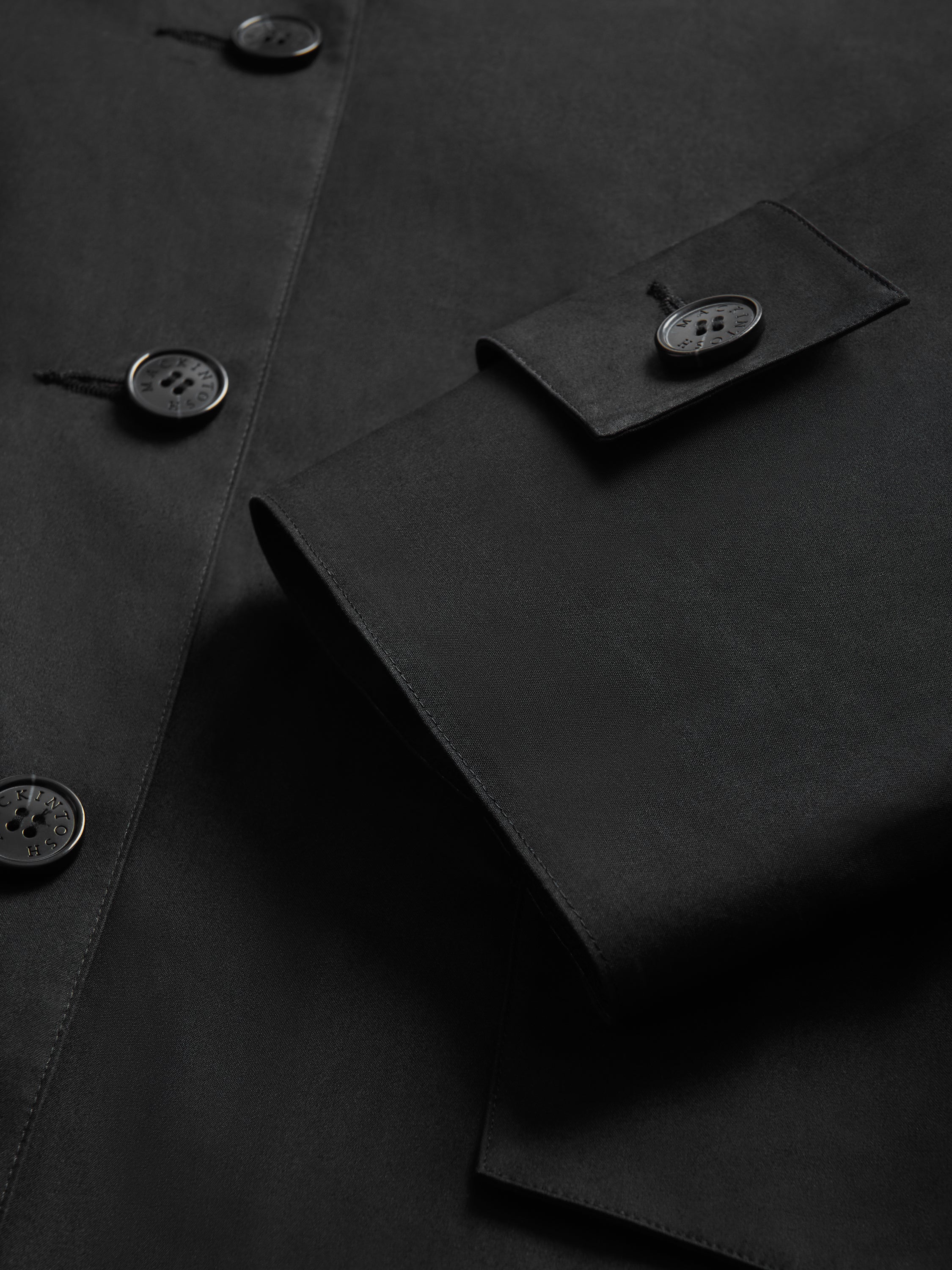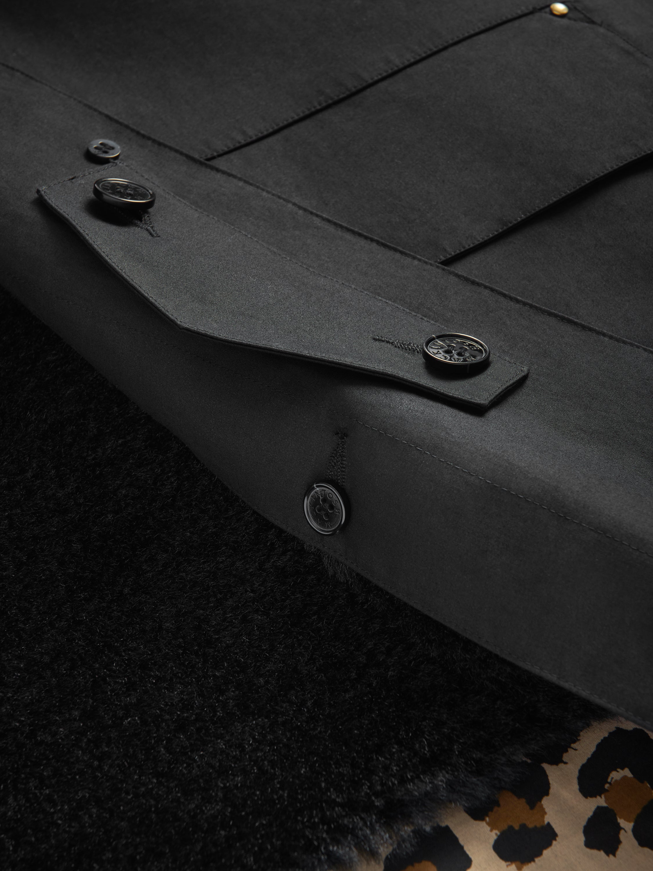 Short balmacaan coat with drop shoulders. An impressive piece with an oversized A line wide silhouette. The modern design stands out with authentic details such as rivet-reinforced flap pockets and a detachable chin tab. A leopard print is used on the back side, and comes with a detachable liner made of ECO fur, making it suitable for all seasons.
