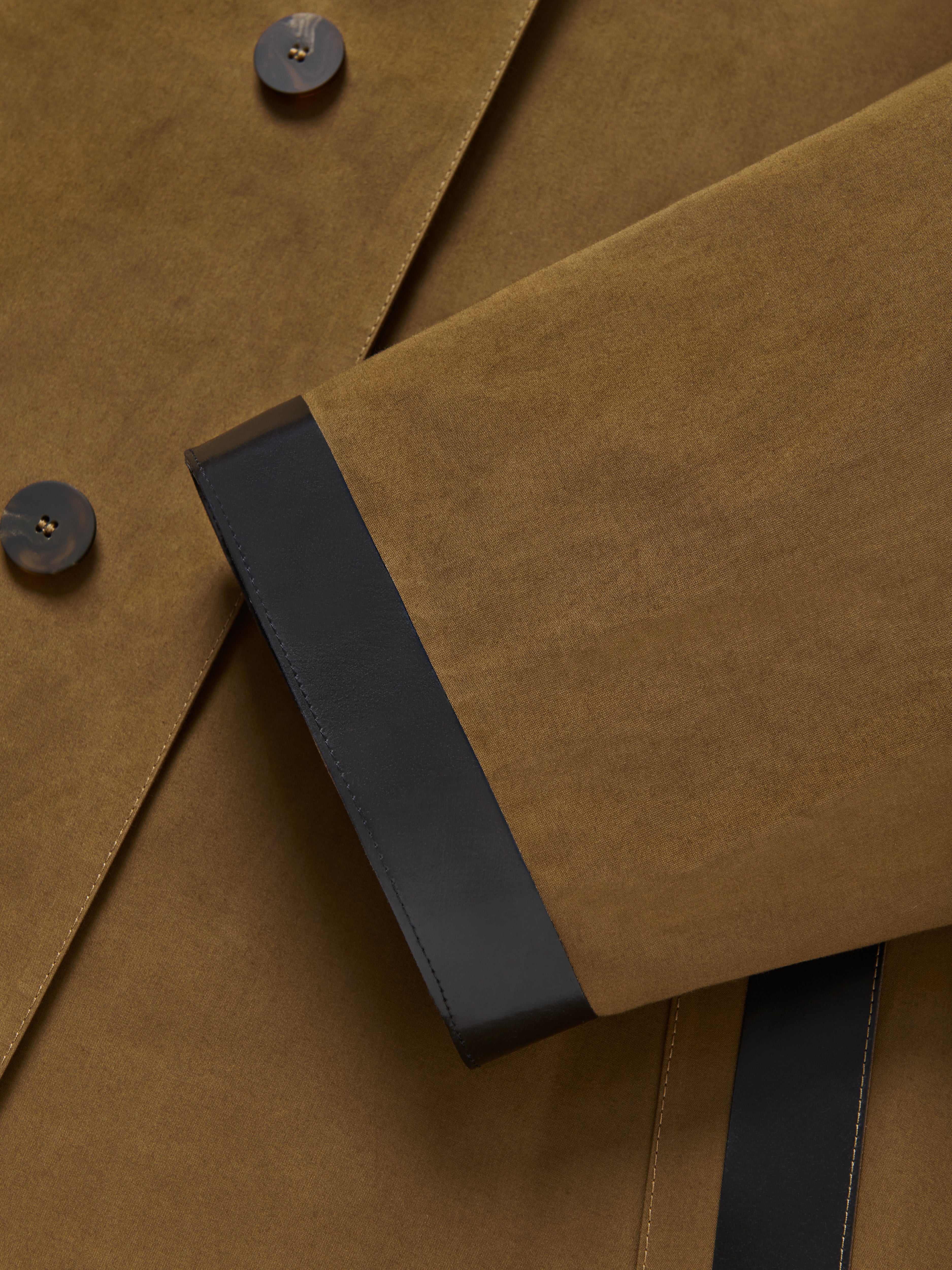 An ode to the best of British craftsmanship, Studio Nicholson’s collaboration with Mackintosh sees Ettrick produced as a contemporary update on the classic knee-length raincoat. Handcrafted in Scotland by a skilled artisan, it’s made from Mackintosh’s signature rubberised bonded cotton: a hard-wearing fabric comprised of two layers of high-quality cotton bonded together to create a fully waterproof finish. Shaped to a generous oversized frame that recalls SN’s modern approach to cut, Ettrick is finished with black hand-taped seams and a button-fastening throat guard for extra protection from the elements.