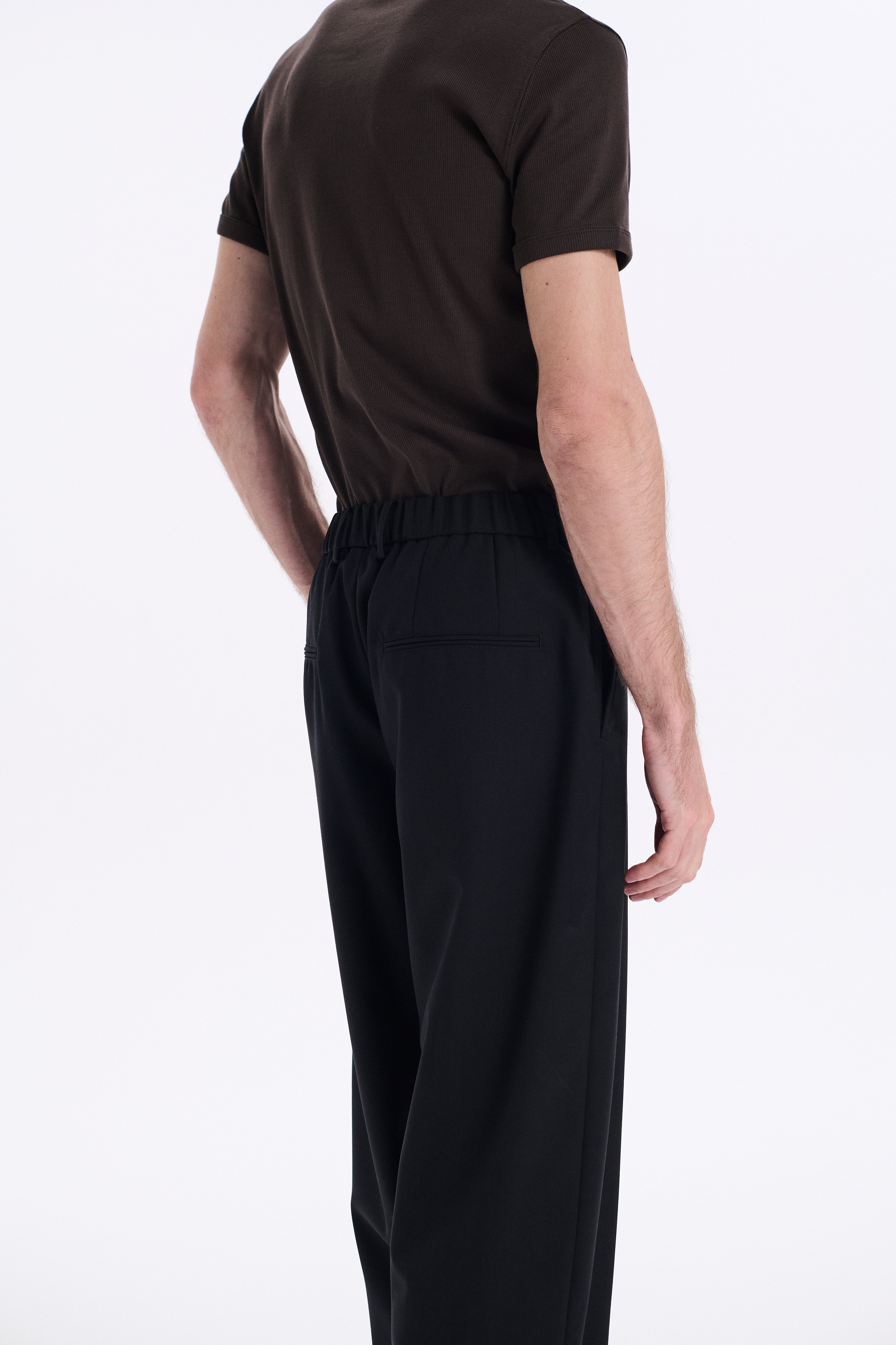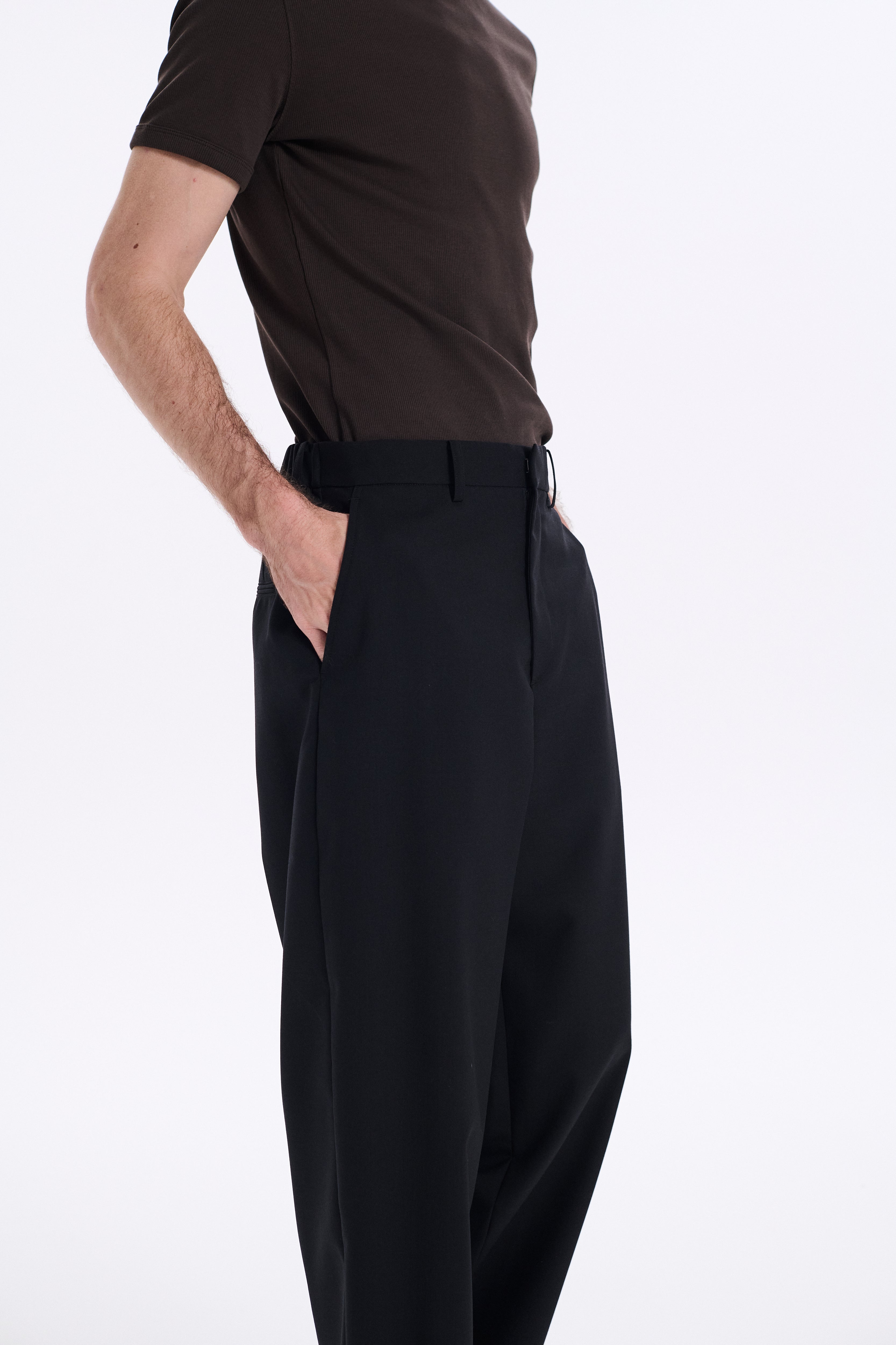 Pants designed with a minimal rounded "barrel" silhouette. Despite the voluminous curves, they maintain a surprisingly clean and sharp impression. The side seams taper gently toward the hem, offering a relaxed fit that conceals the leg line while perfectly balancing elegance with effortless comfort. Finished with a half-lining.