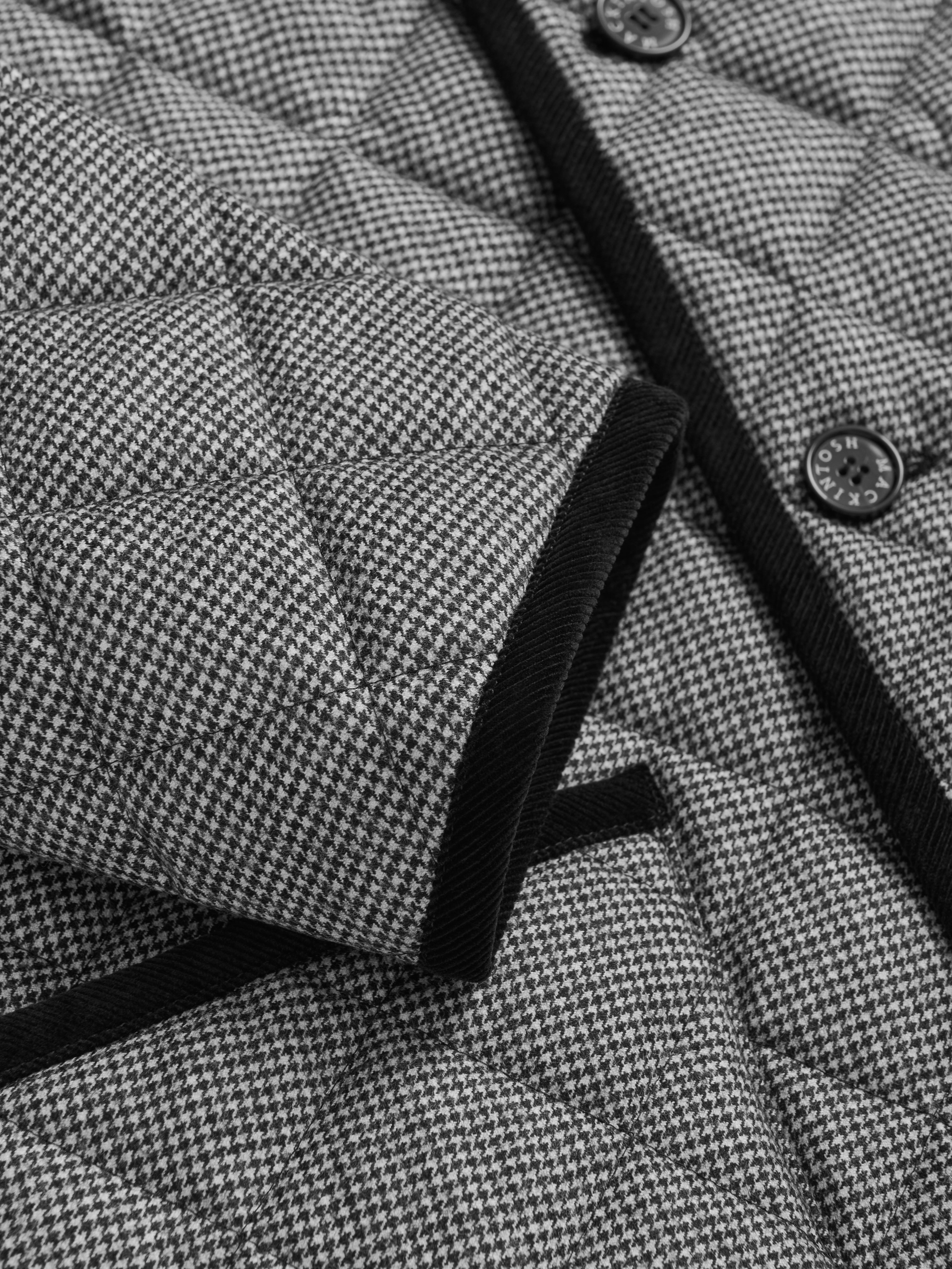 A versatile quilted jacket in a black & white Glencheck with patch pockets, corduroy collar, pocket & placket detailing.
