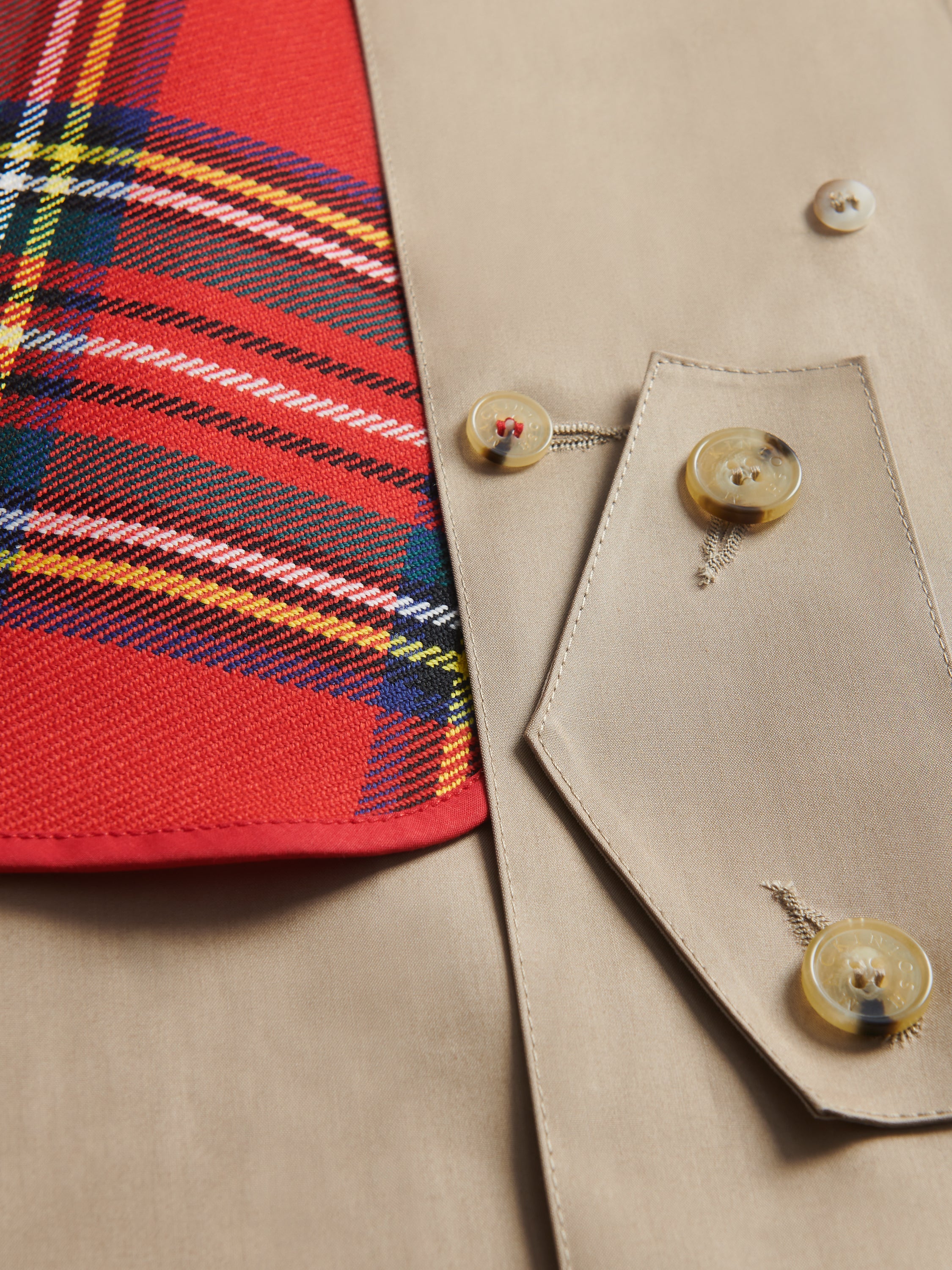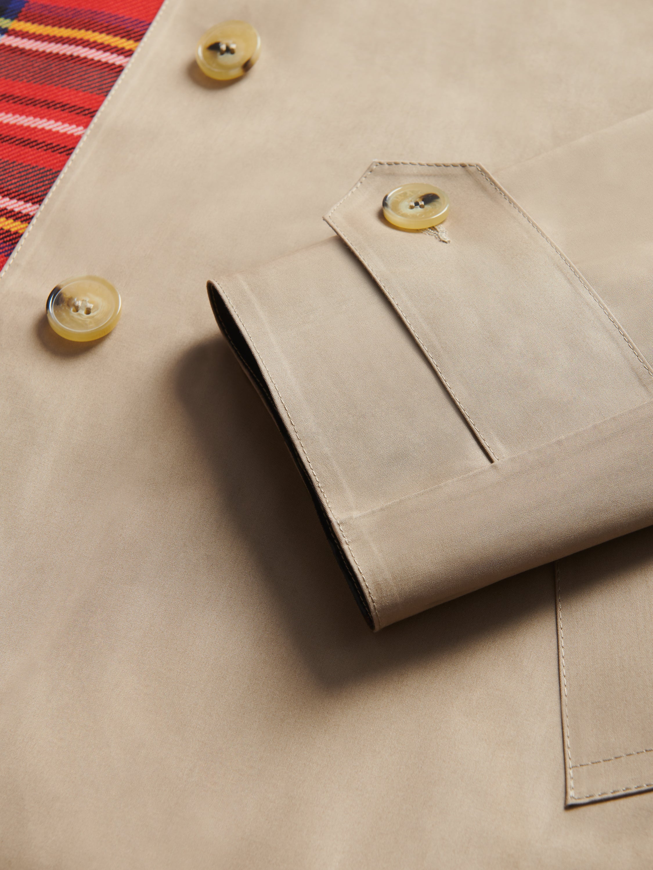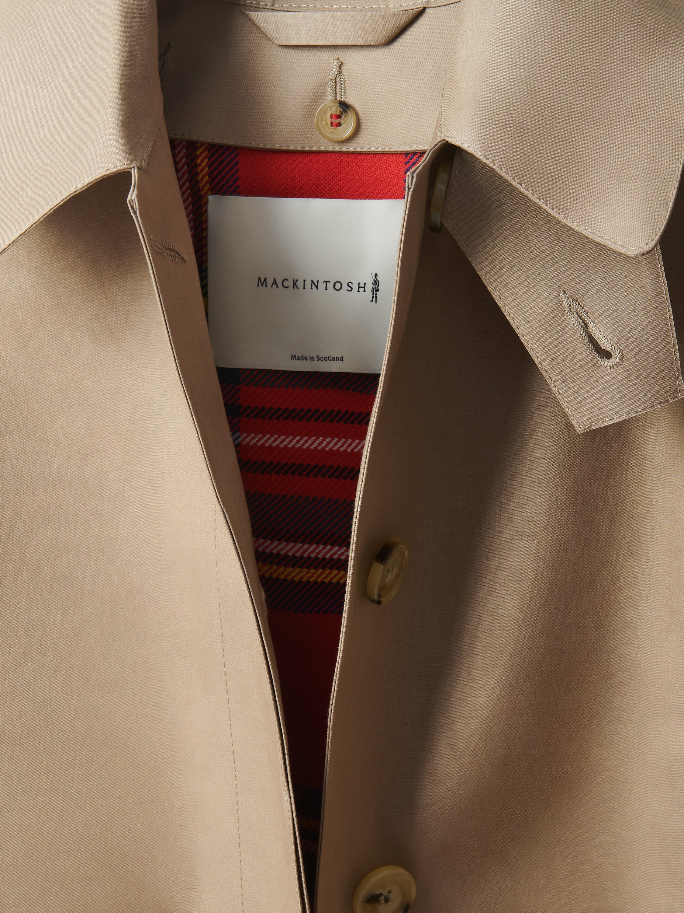 Mackintosh signature model. This piece has a timeless, minimalist design that is not influenced by trends, and a beautiful A-line silhouette. Comes with a detachable tartan check wool liner for all-season wear.
