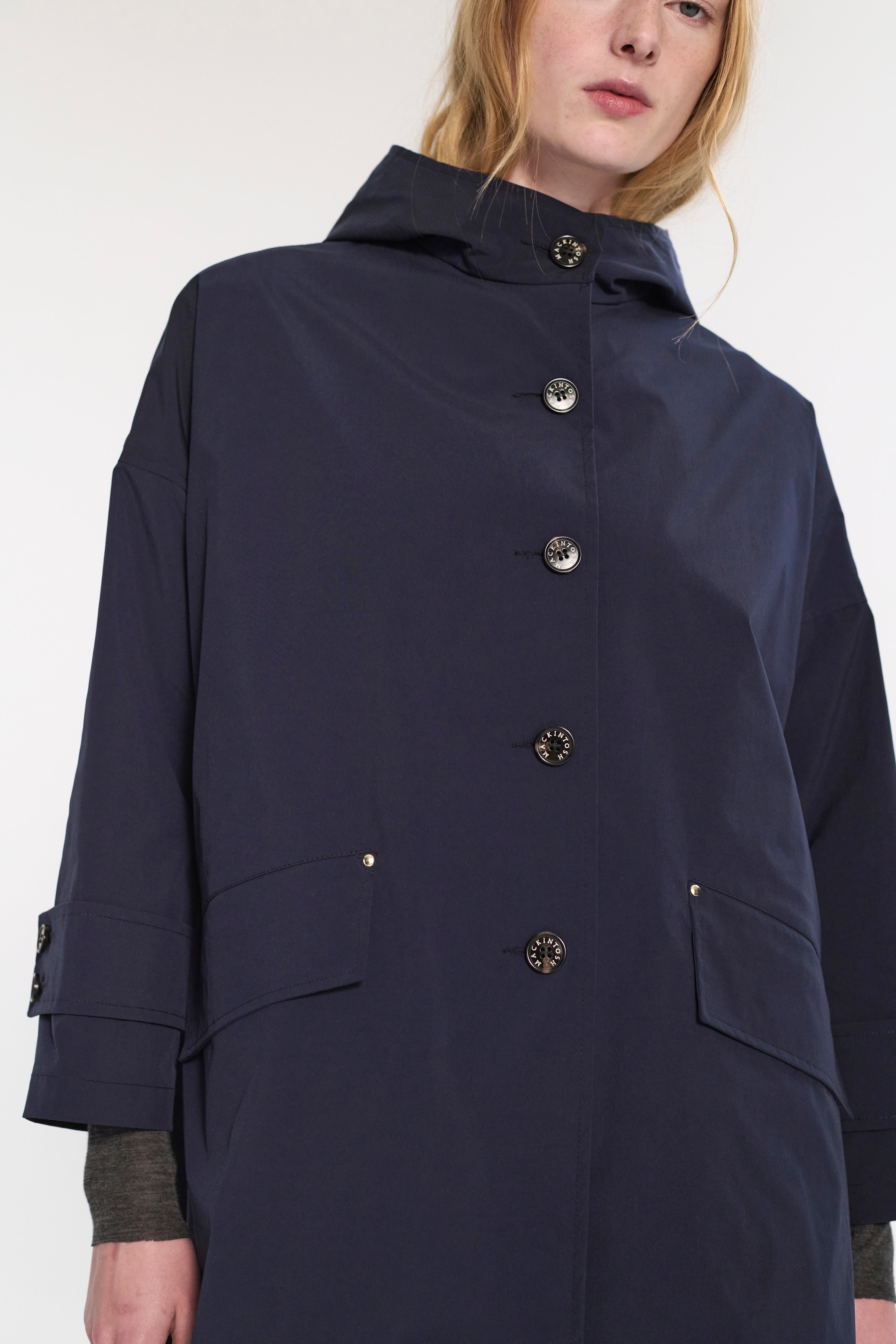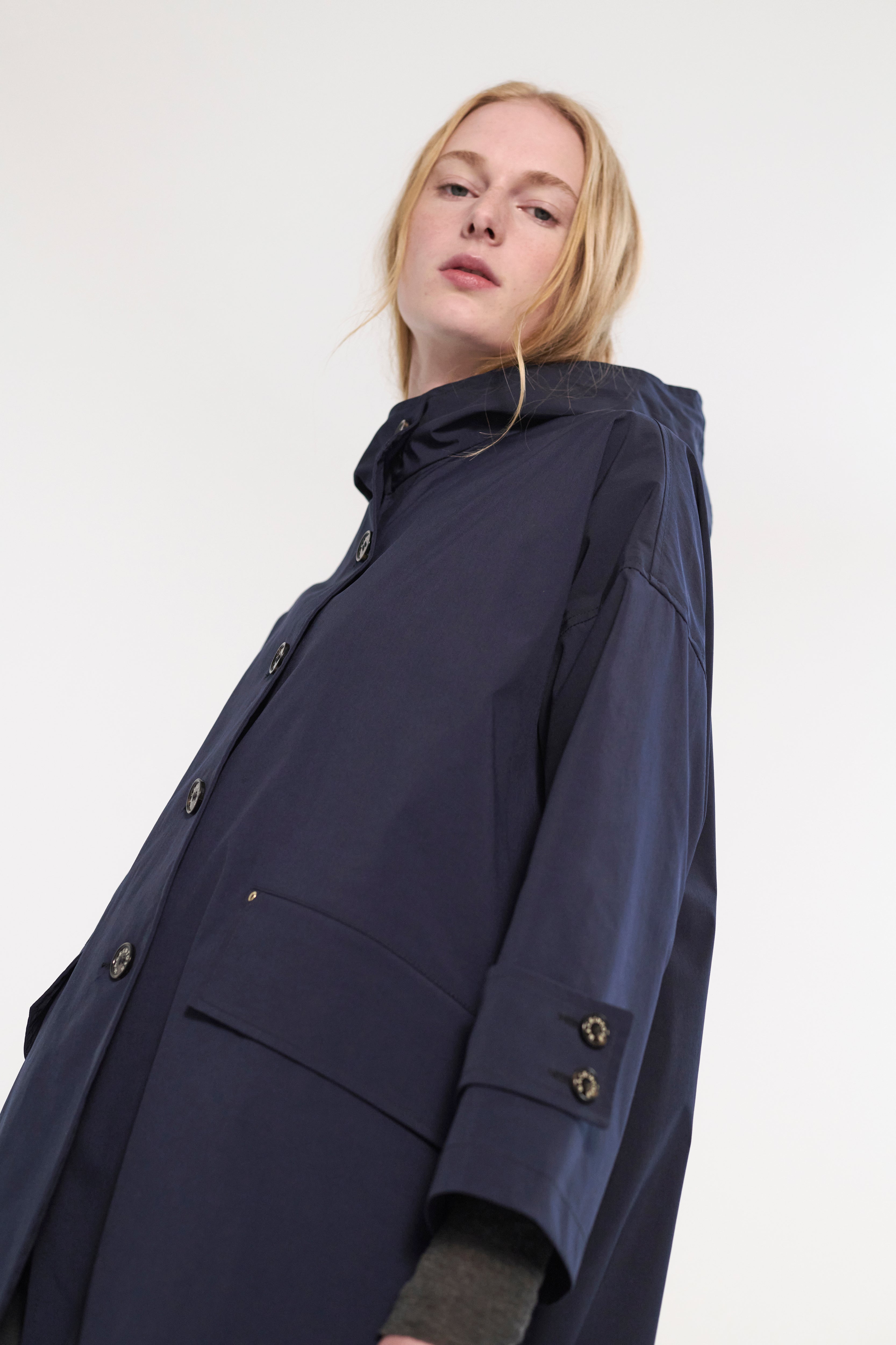 This version of the Humbie coat offers all of the chic design of the classic Humbie model, but with drop shoulder styling and a clean, hooded design for an elegant twist that also performs perfectly on rainy days. With its highly water-repellent fabric, made from 60% recycled materials, the short-style coat is lightweight yet with a structured firmness that flatters.