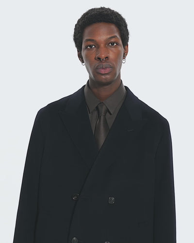 The Crawford is a new four-button navy double-breasted, 100% cashmere, chesterfield coat. It's a modern chesterfield coat featuring a beautiful silhouette thanks to its three-dimensional pattern structure, slender peak lapels that suit a wide range of styles for both formal and casual wear, a low gorge line, and a minimalist design without a breast pocket. Its unconstructed tailoring ensures a light and comfortable fit.