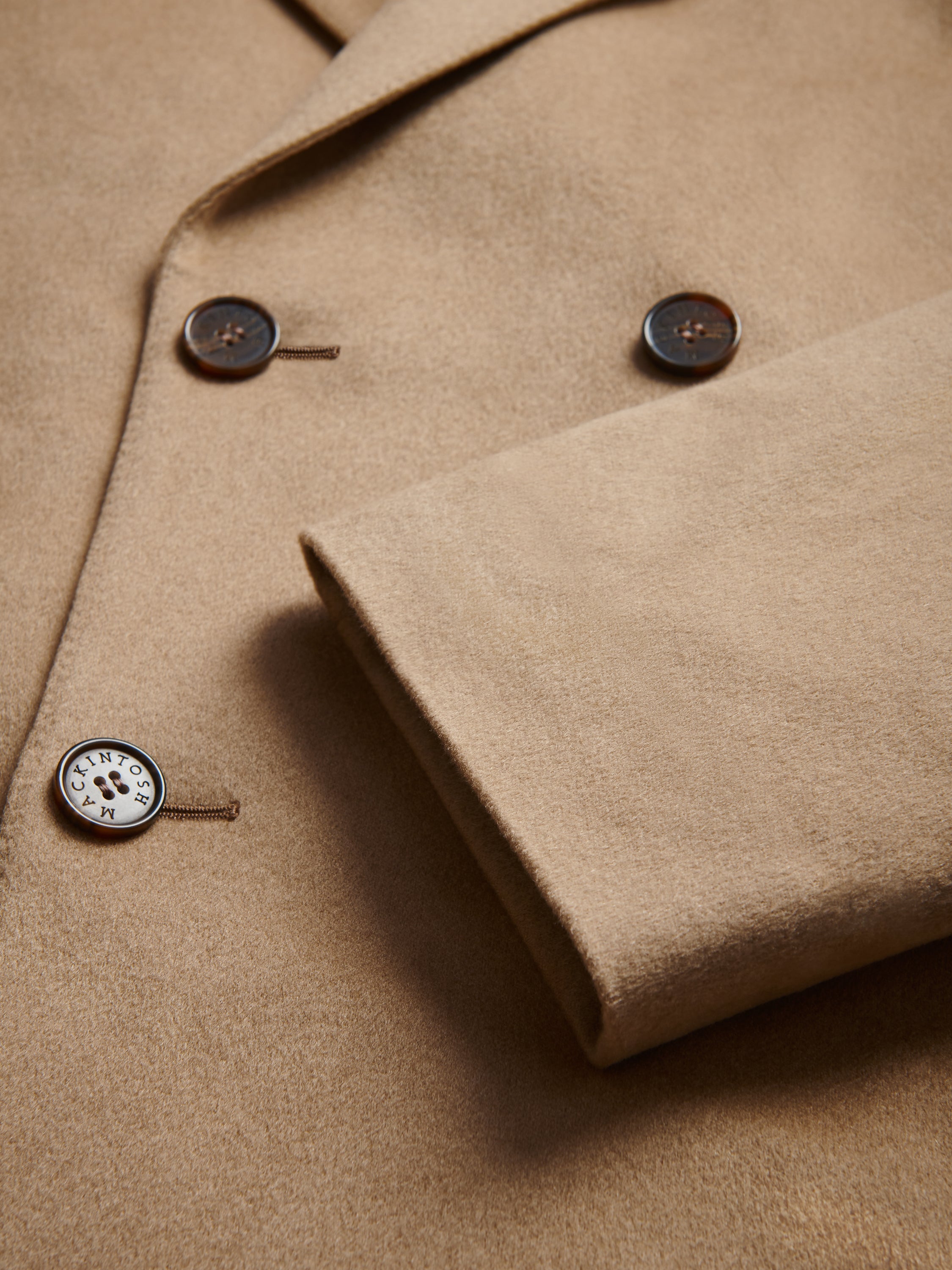 新モデルの「CRAWFORD」は、4つボタンのダブルブレスト、100%カシミヤ製のチェスターフィールドコートです。