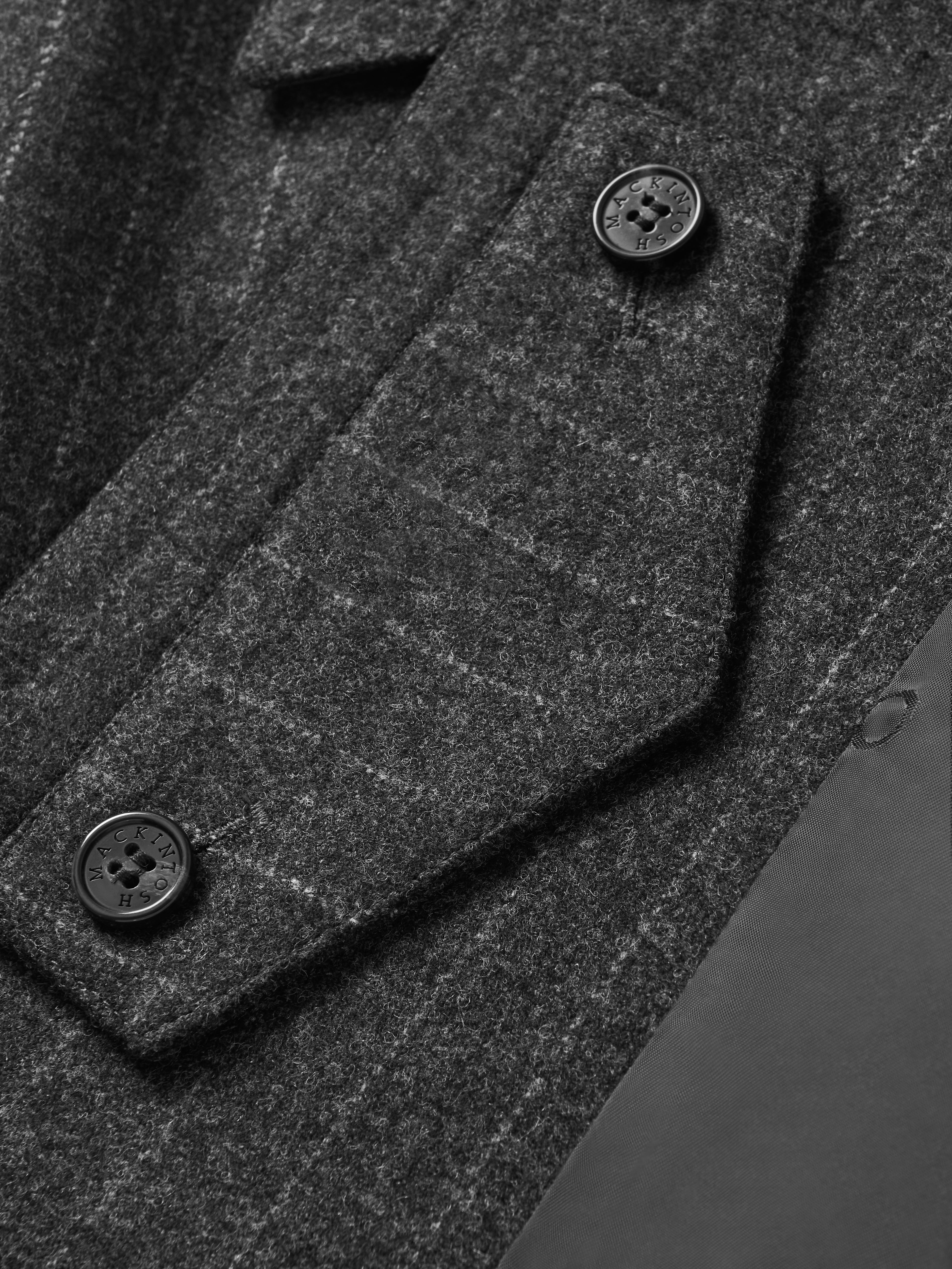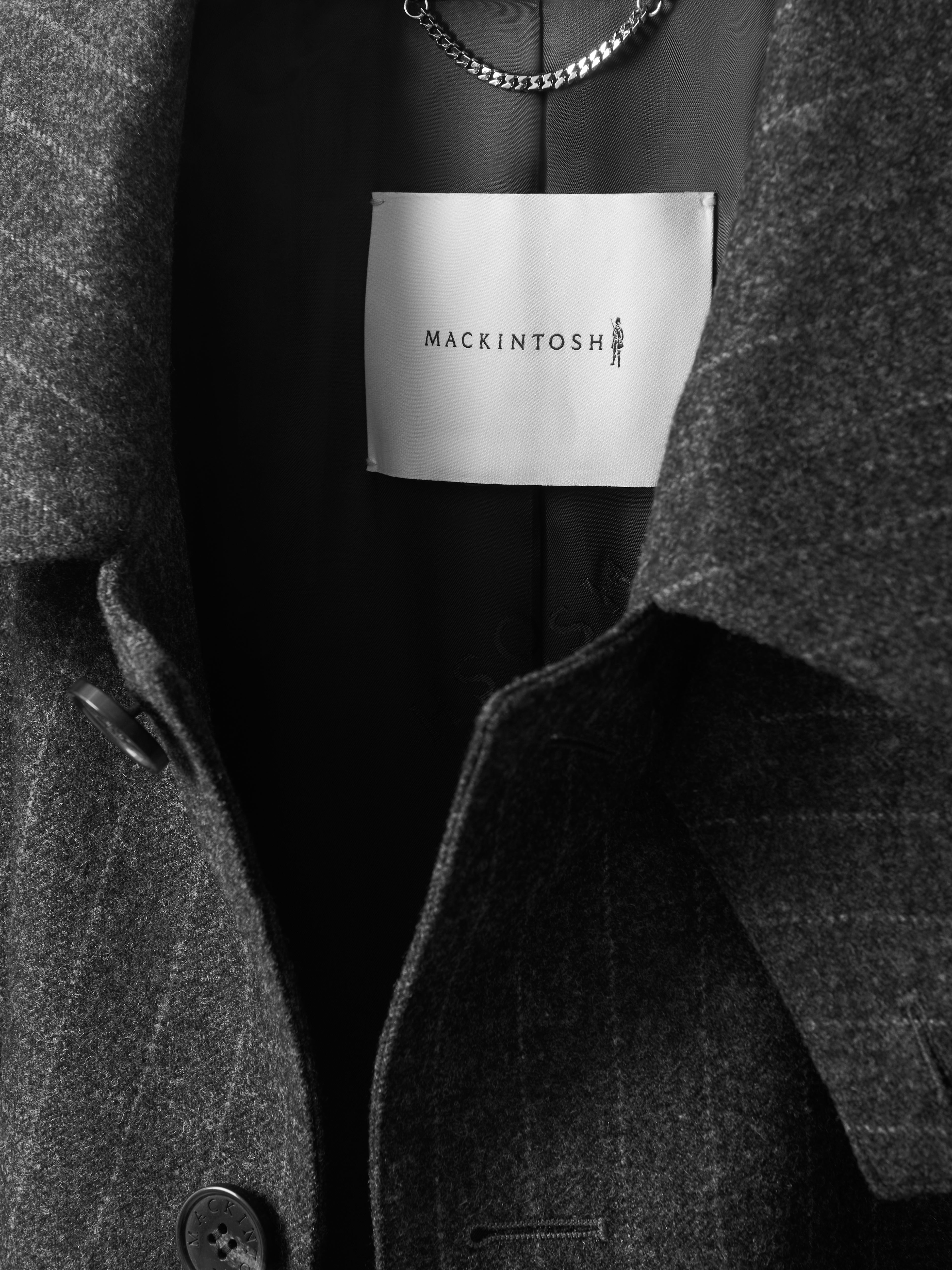 チャコールのチョークストライプ柄、英国産ウール100%のハンビースリムコート