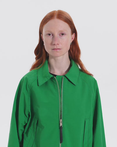 This piece strikes a modern balance between its cropped length and voluminous body. Its elegant raglan zip-up blouson design boasts a beautiful silhouette and versatile coordination, allowing you to enjoy a wide range of styling options by blousing the waist. The leather zipper pull also serves as an accent.