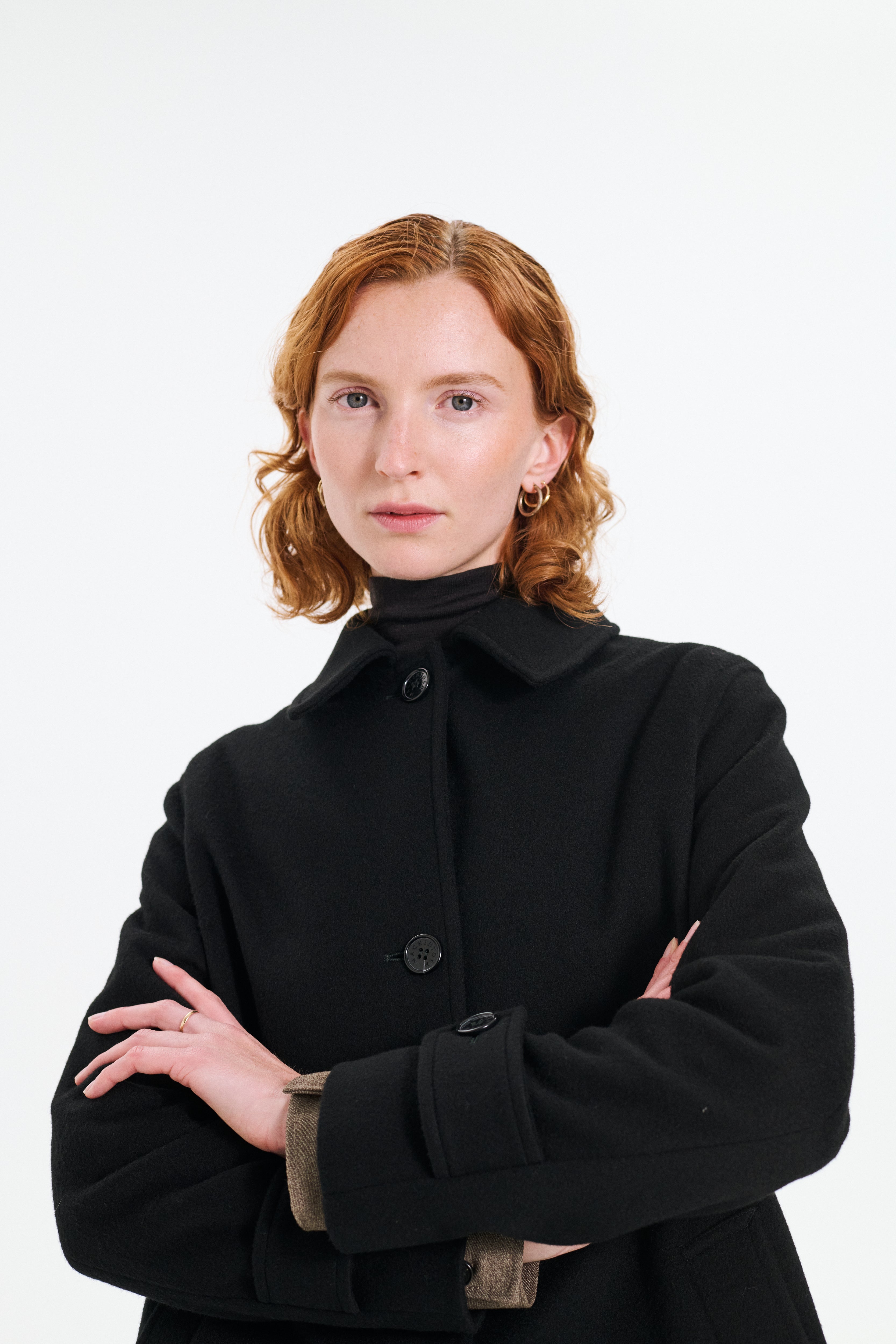 Our ladies Banton knee lenth wool, cashmere blend car coat, made in the UK.