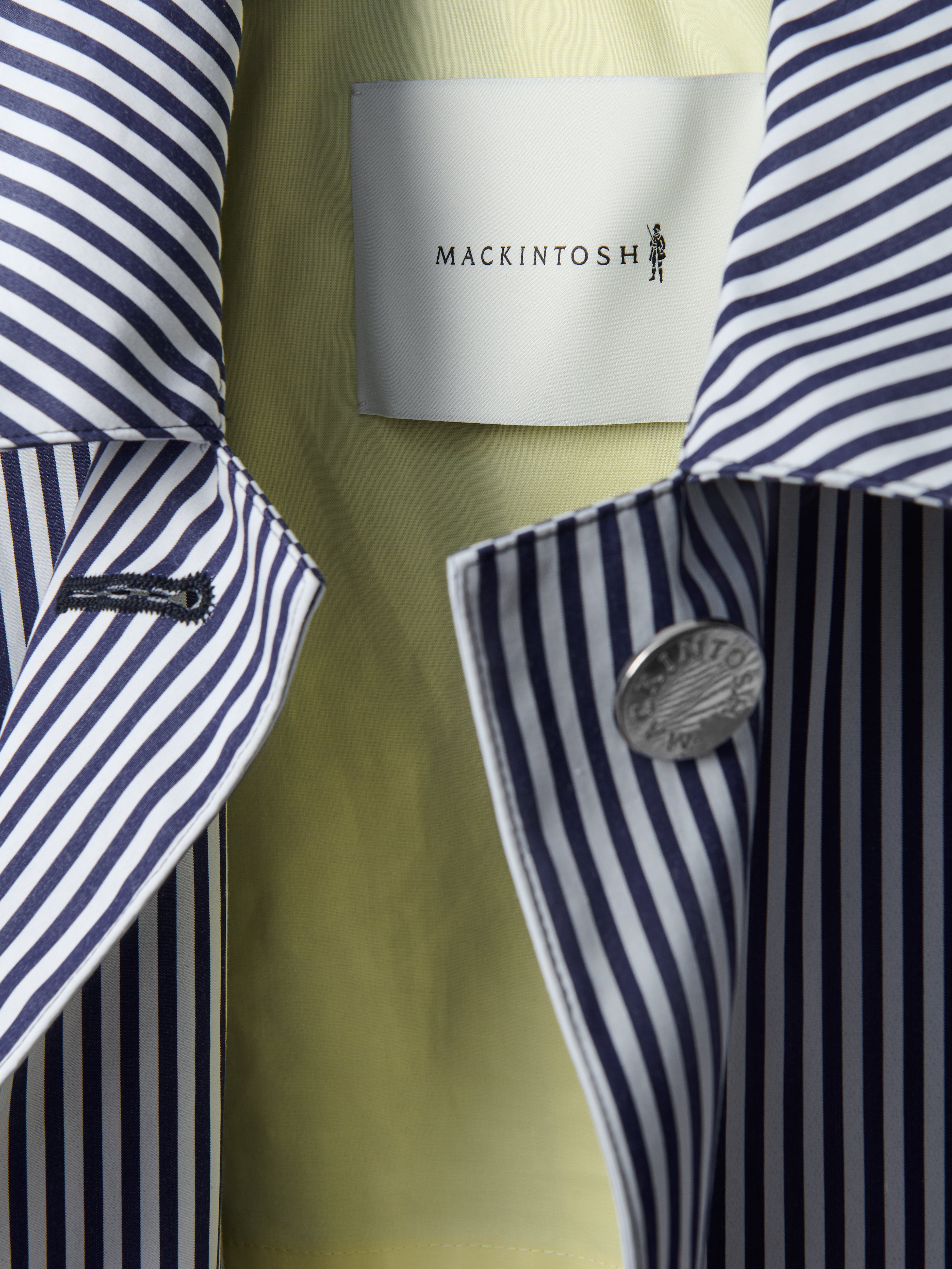 This coat offers a feminine impression with its cropped sleeves and cocoon silhouette. It's a striking piece that features a stripe pattern, accented by its minimalist design and metallic details.