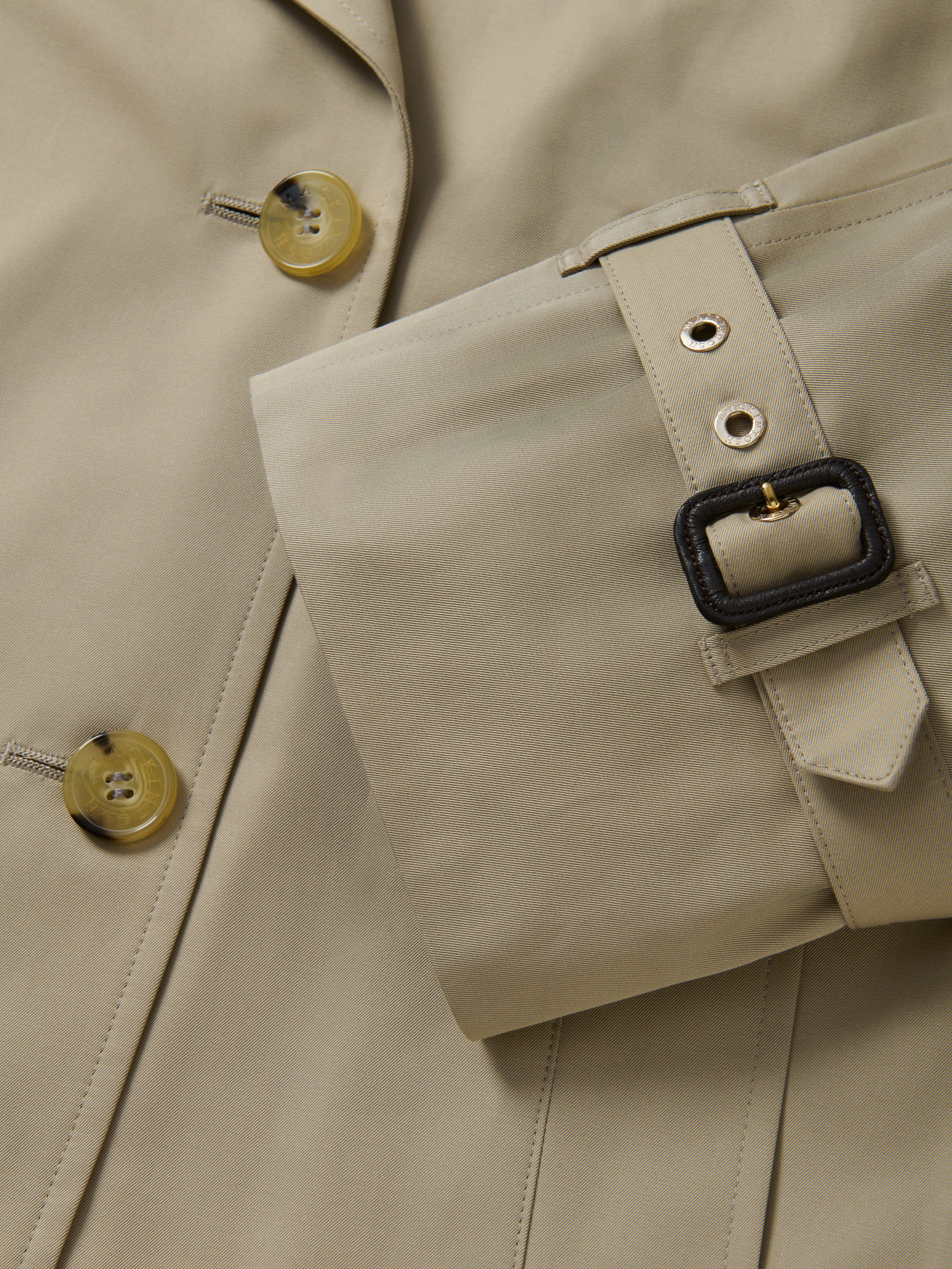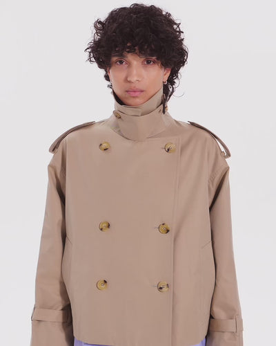 The short-length version of the Buckholme oversized trench coat. It retains the authentic details reminiscent of a military trench coat and the voluminous, fashion-forward silhouette, while featuring a striking, shorter length.