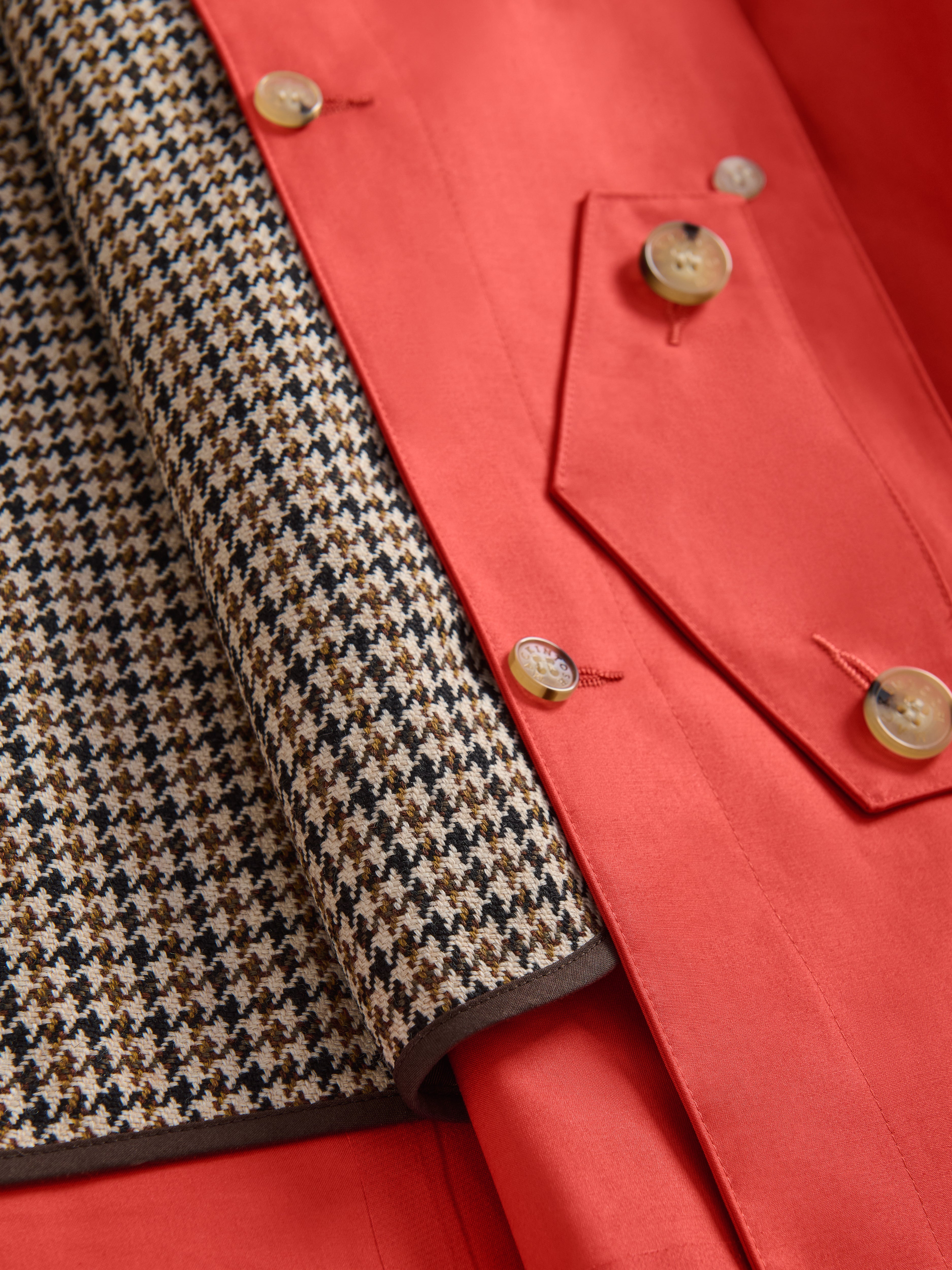 ドロップショルダーのショート丈バルマカーンコート。オーバーサイズのAラインのワイドシルエットが印象的な一着です。リベットで補強されたフラップポケットや、取り外し可能なネックラッチといったオーセンティックなディテールが、モダンなデザインを際立たせています。イングリッシュハウンドトゥース柄のソフトなツイード製デタッチャブルライナーが付属し、オールシーズン着用可能です。
