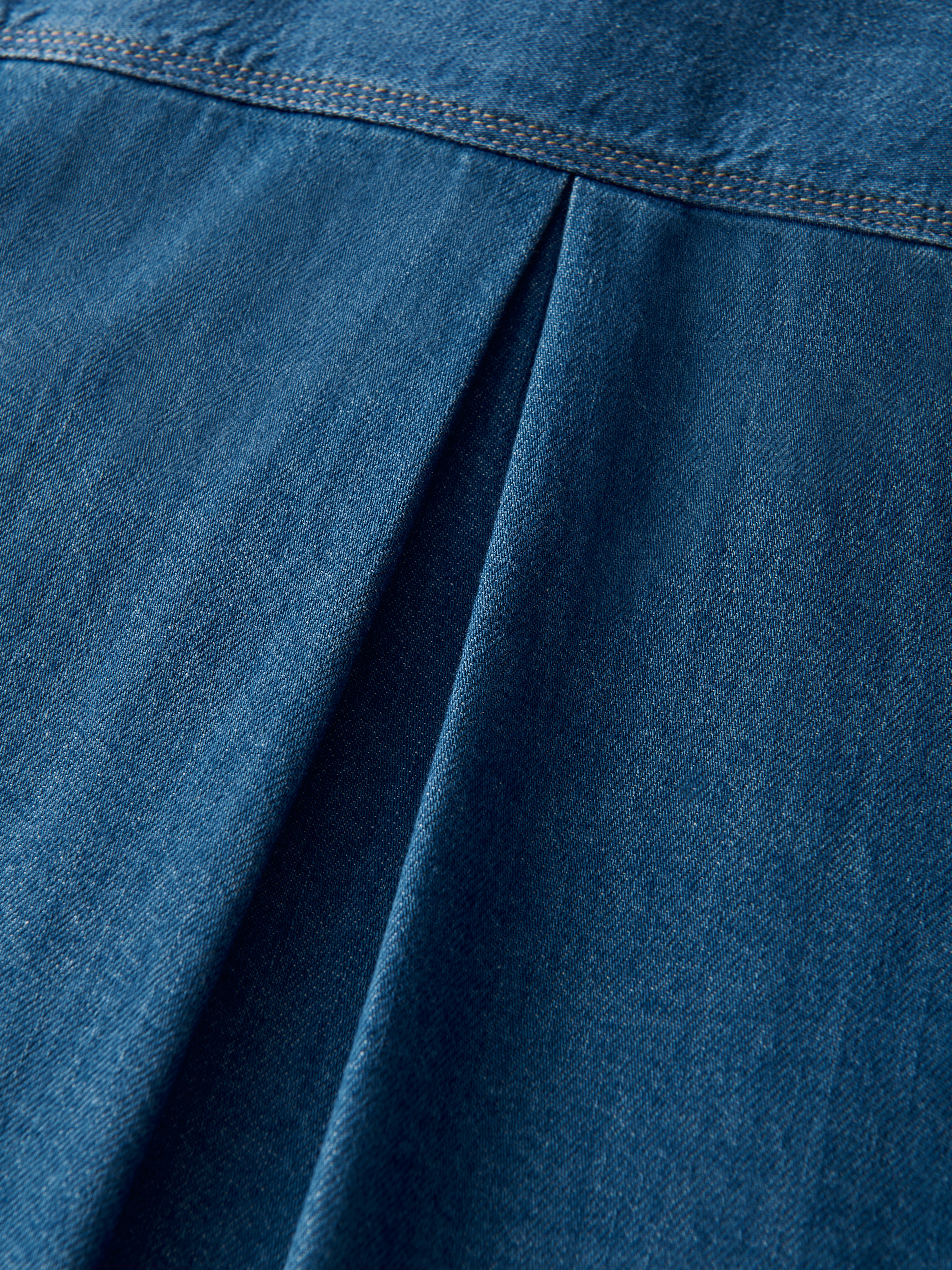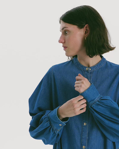 This is the dress version of the classic stand-collar shirt, Thornhill. It's a striking piece featuring high-gloss finished dot buttons and dramatically voluminous puff sleeves.