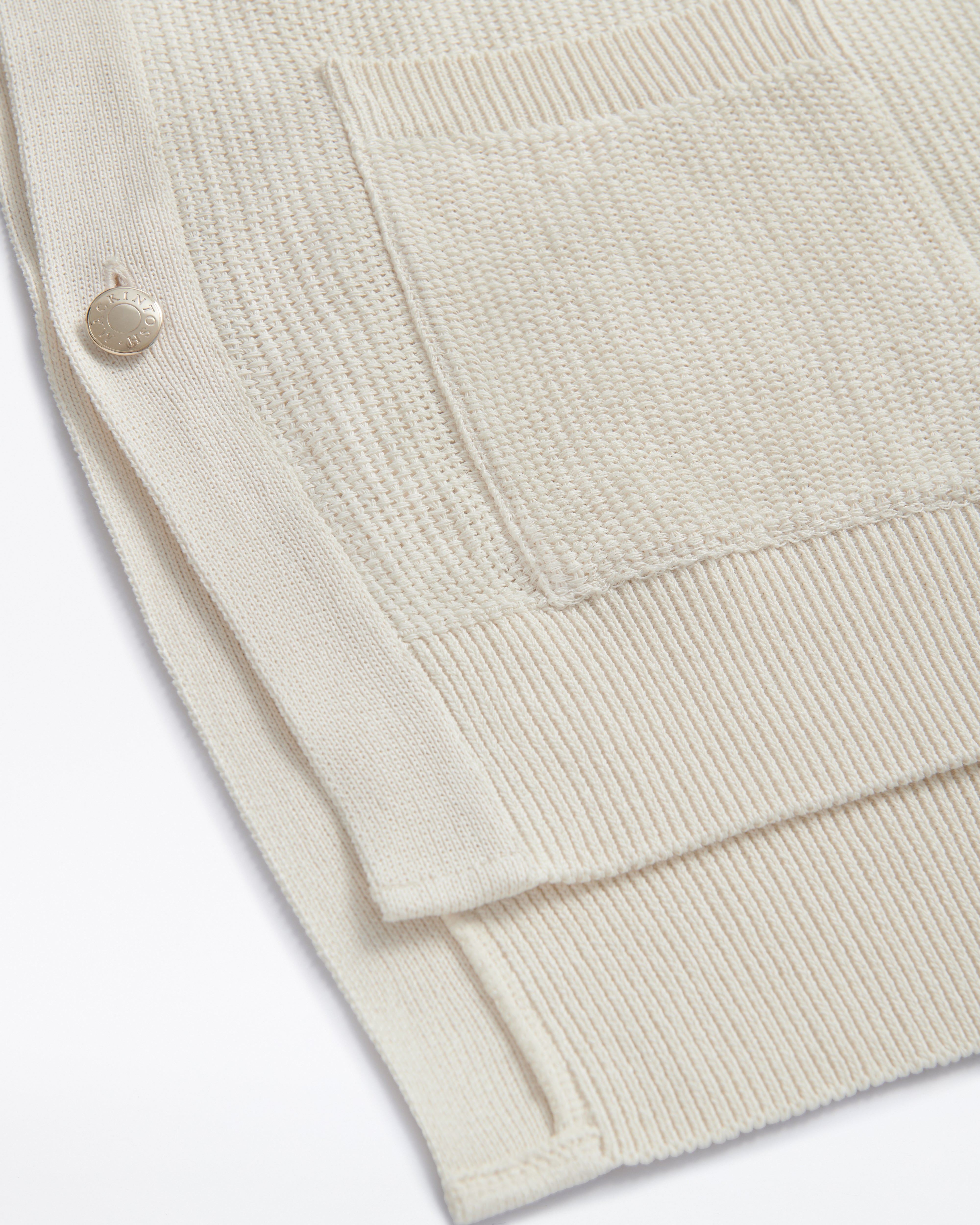 さらりとしたドライな肌触りでありながら、肌には柔らかくフィットします。ゴールドのボタンとフロントの二つのポケットが特徴です。