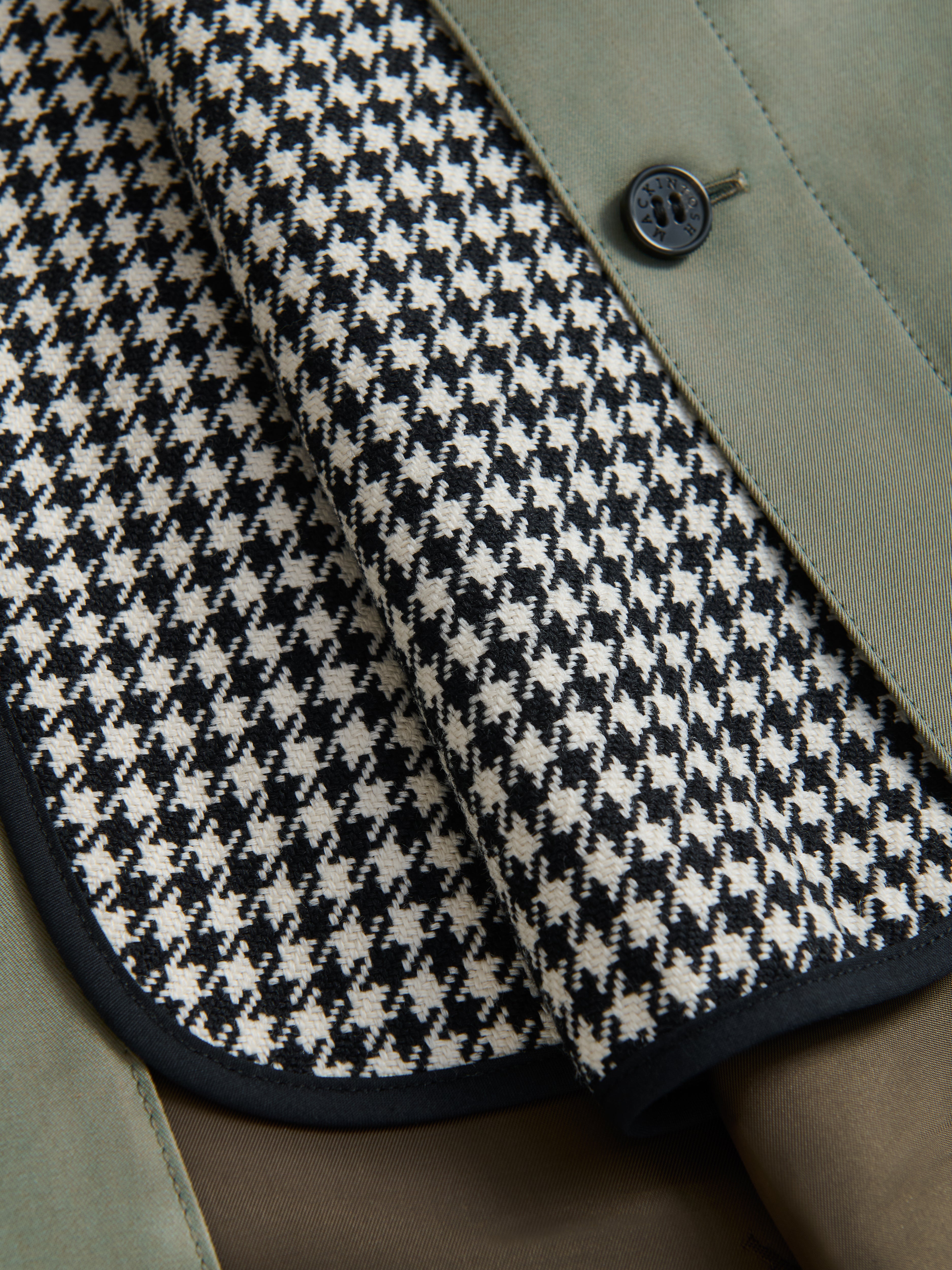 This classic trench coat has authentic tailoring with attention to detail such as epaulettes, gun patches, and inverted pleats, and a beautiful silhouette from the waist to the hem that gives a feminine and elegant impression. Comes with a detachable liner made of soft tweed with an English houndstooth pattern, making it suitable for all seasons.